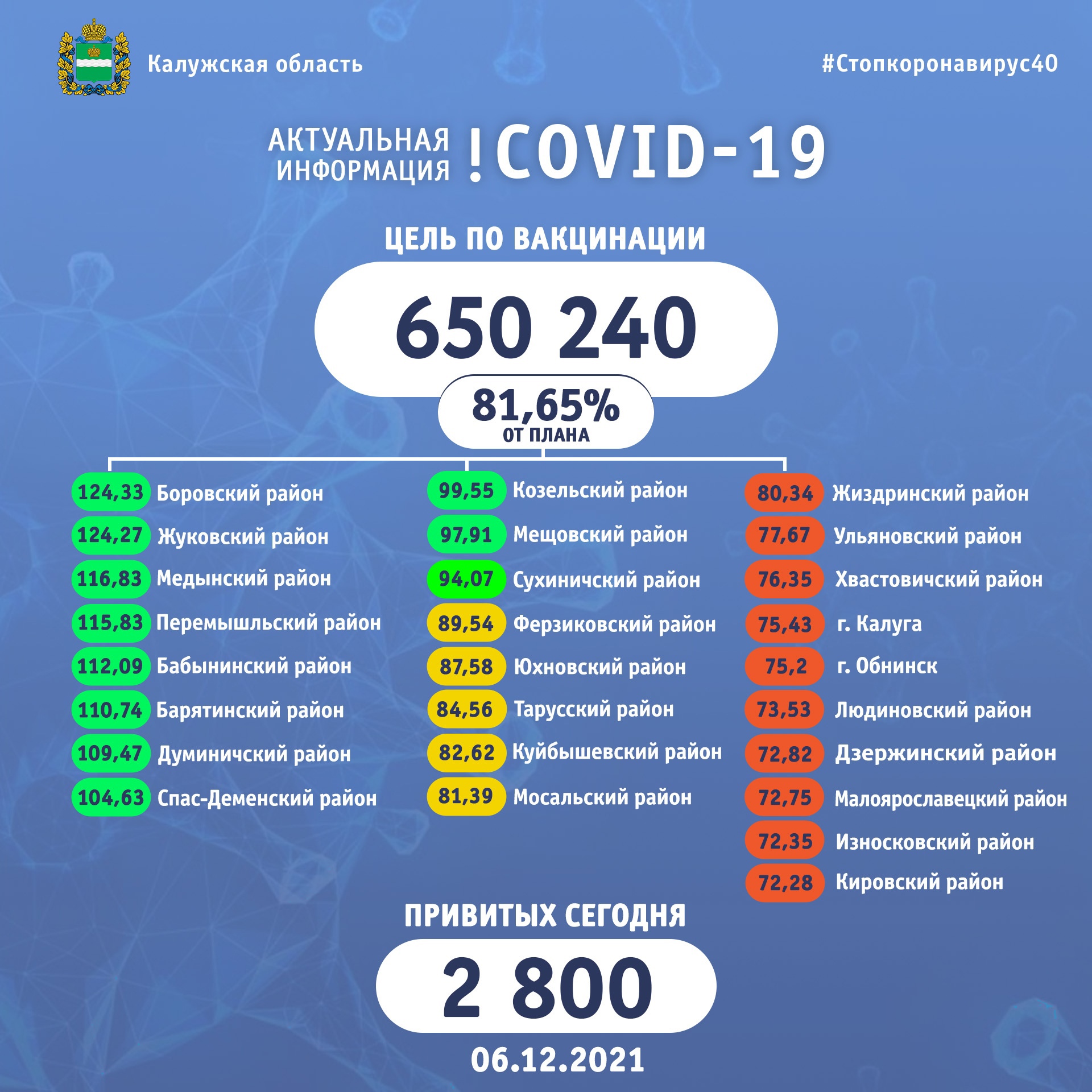 Выполнение плана по вакцинации от коронавируса в районах Калужской области на 6 декабря 2021 года: