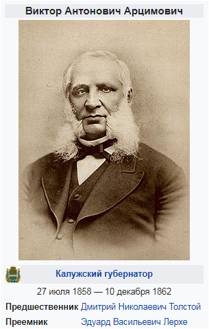 1862 – пост калужского губернатора покинул Виктор Антонович Арцимович (19.04.1820 – 2.03.1893), государственный деятель, действительный тайный советник, сенатор (1862). При нем оживилась общественная и культурная жизнь губернии, стали издаваться «Памятные книжки», развивалось народное образование.