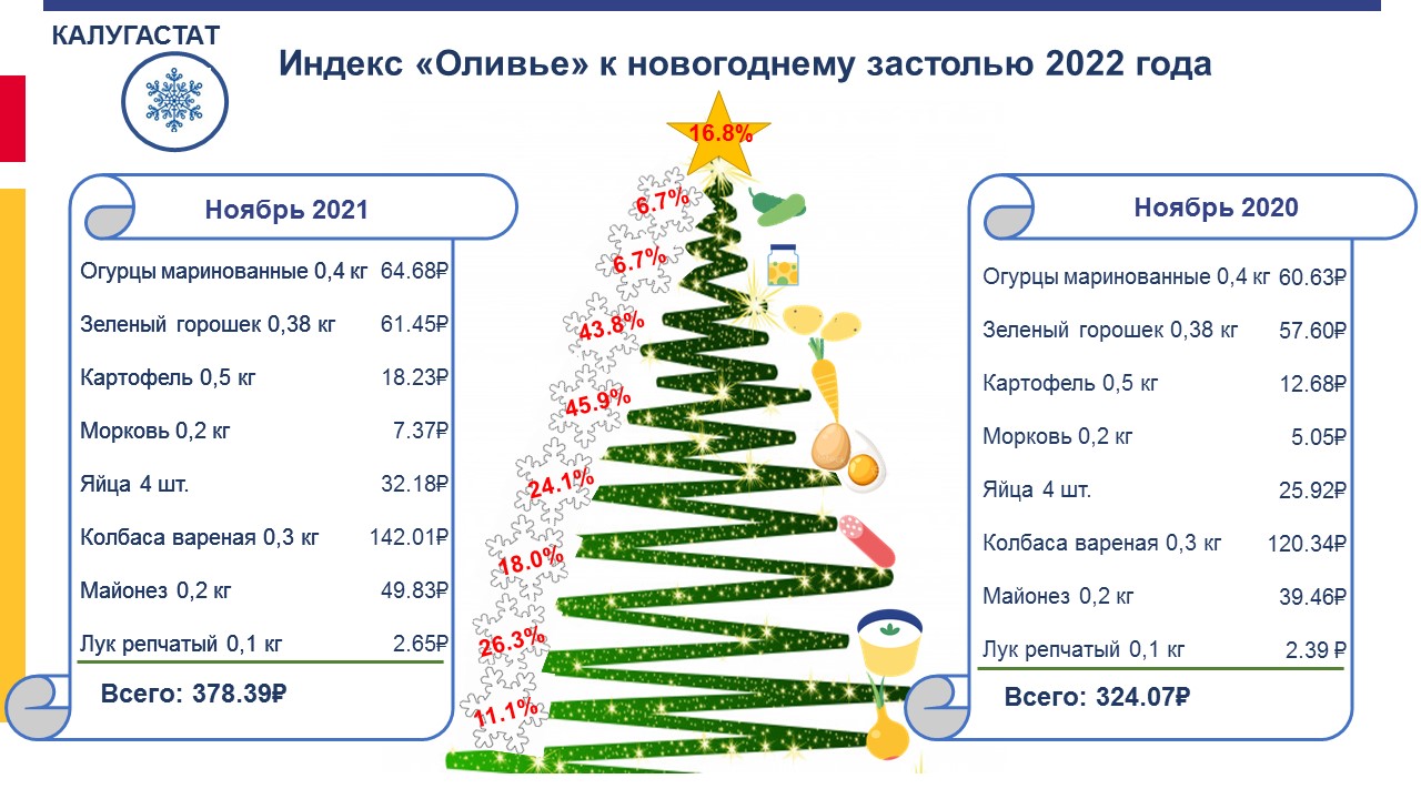 За последний год популярные у жителей Калужской области новогодние салаты «Оливье» и «Селедка под шубой» заметно подорожали. Рост цен на эти блюда превысил официальный уровень инфляции в регионе. Об этом в среду, 15 декабря, сообщил Калугастат.