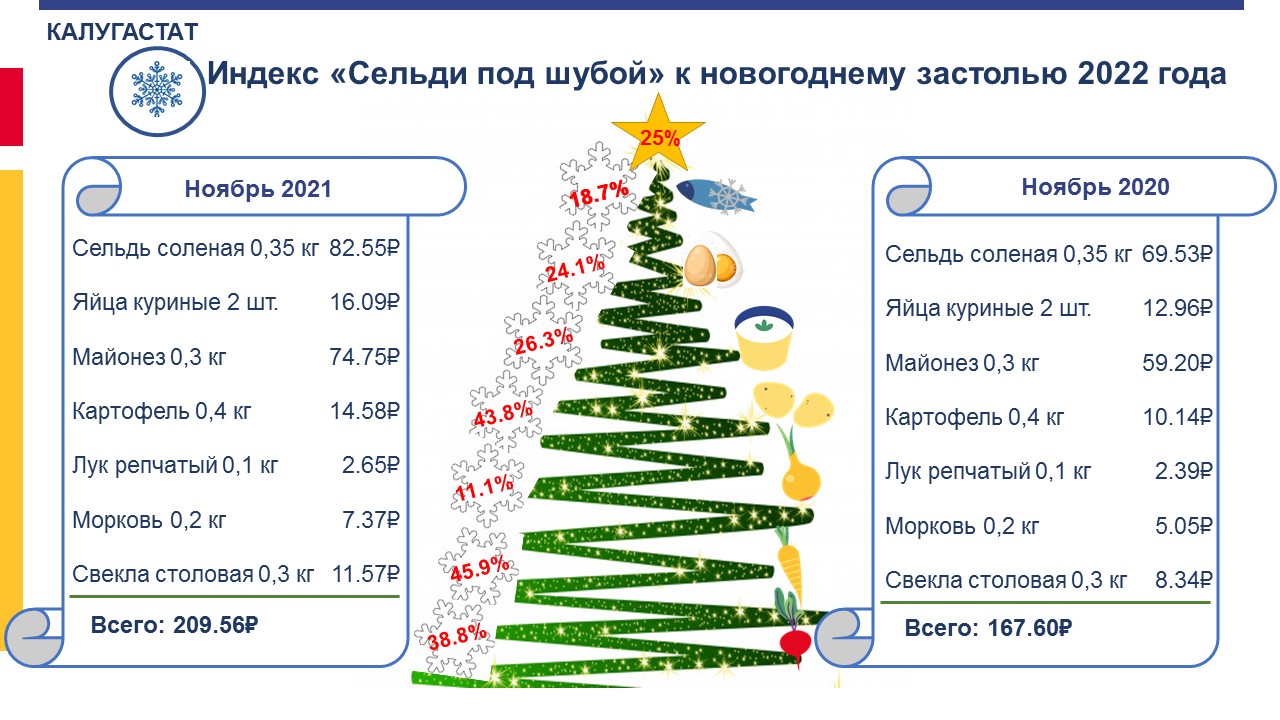 Индекс «Селедки под шубой» составил 25%. Если год назад 1,7 килограмма салата можно было приготовить за 167 рублей, то в нынешнем ноябре – за 209 рублей. Свекла подорожала на 38,8%, майонез – на 26,3%, куриные яйца – на 24,1. Об изменении цен на морковь и картофель упоминалось выше.