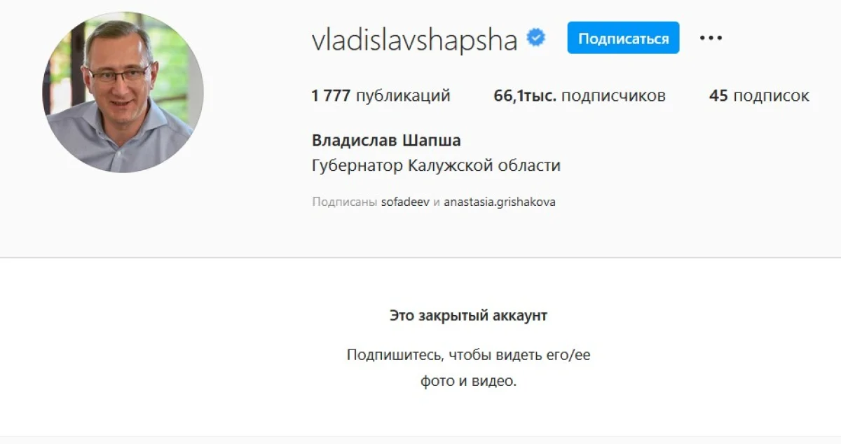 В пятницу, 17 декабря, губернатор Калужской области Владислав ШАПША сделал свой аккаунт в социальной сети I****gram закрытым.