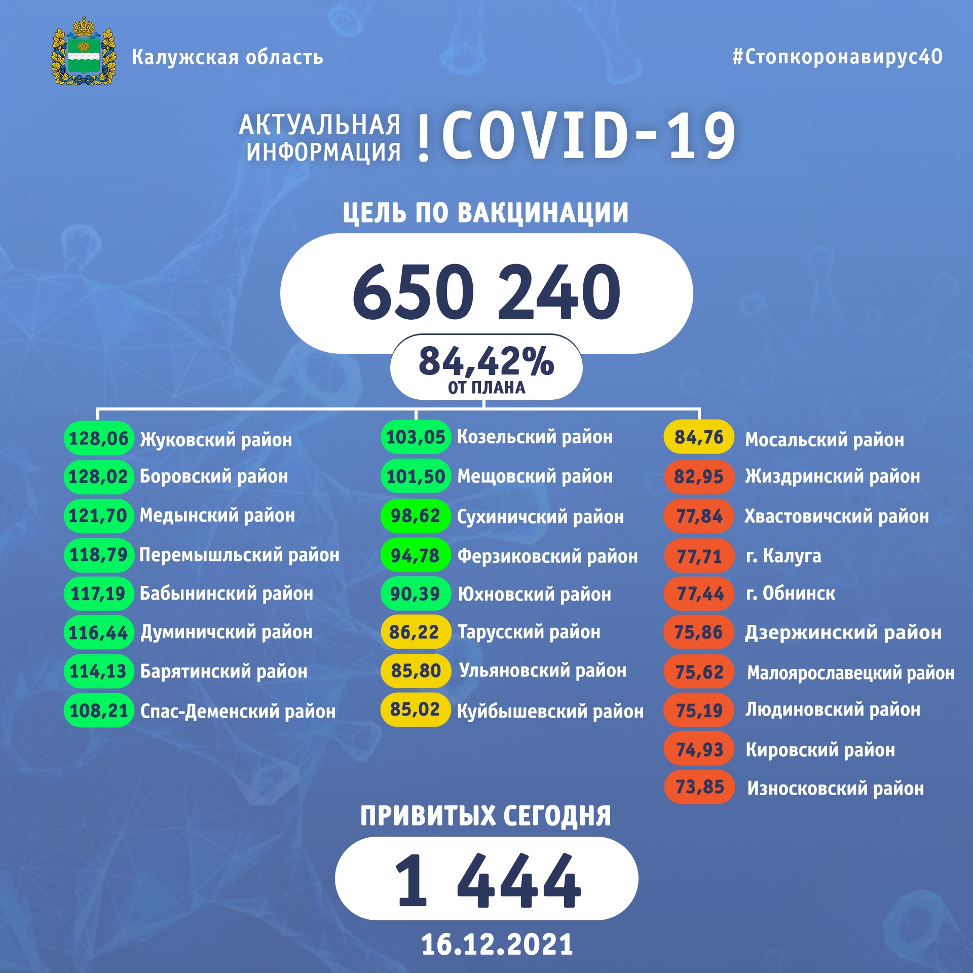 Выполнение плана по вакцинации от коронавируса в районах Калужской области на 16 декабря 2021 года: