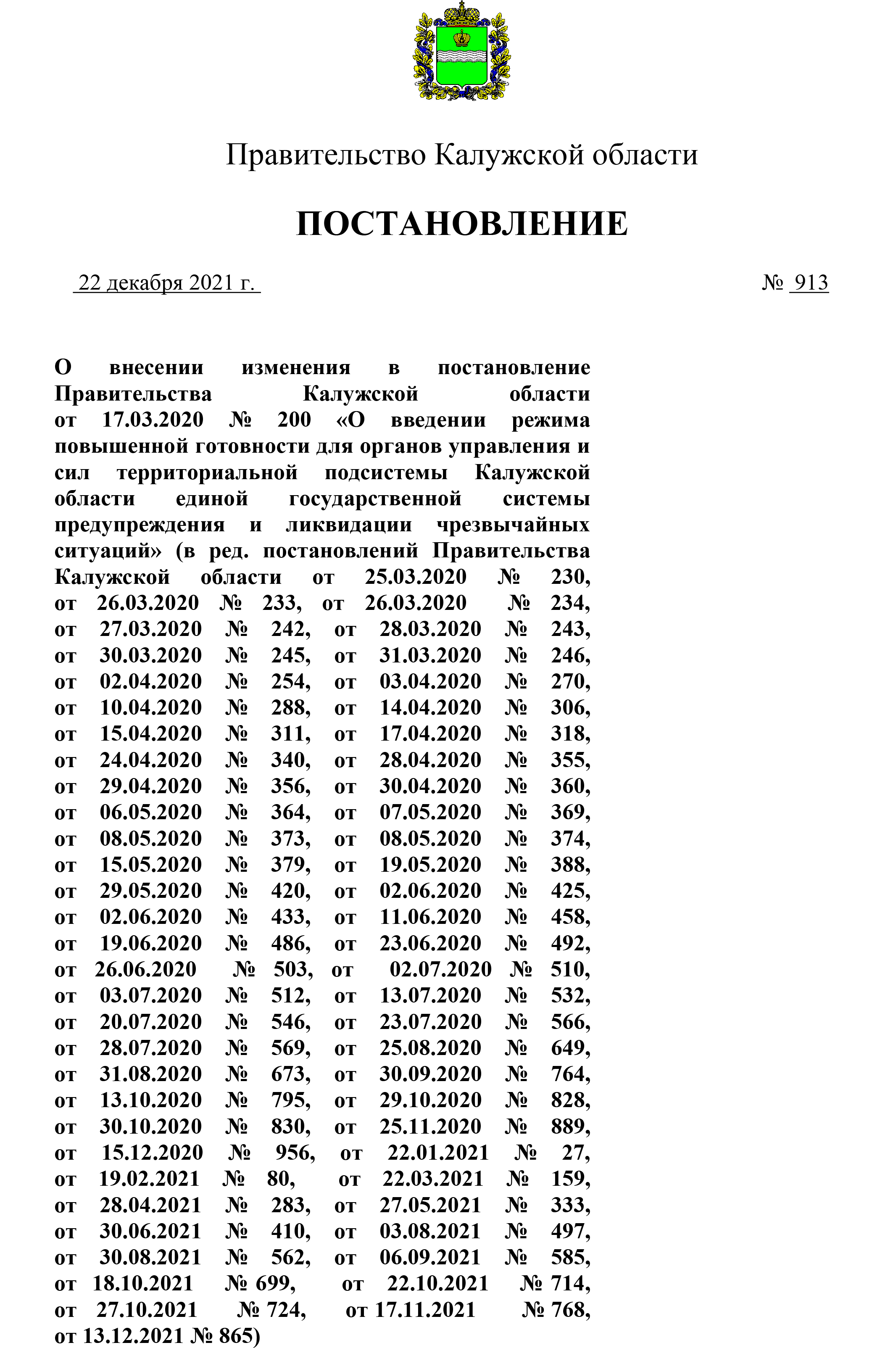 Постановление правительства Калужской области №913 от 22.12.2021: