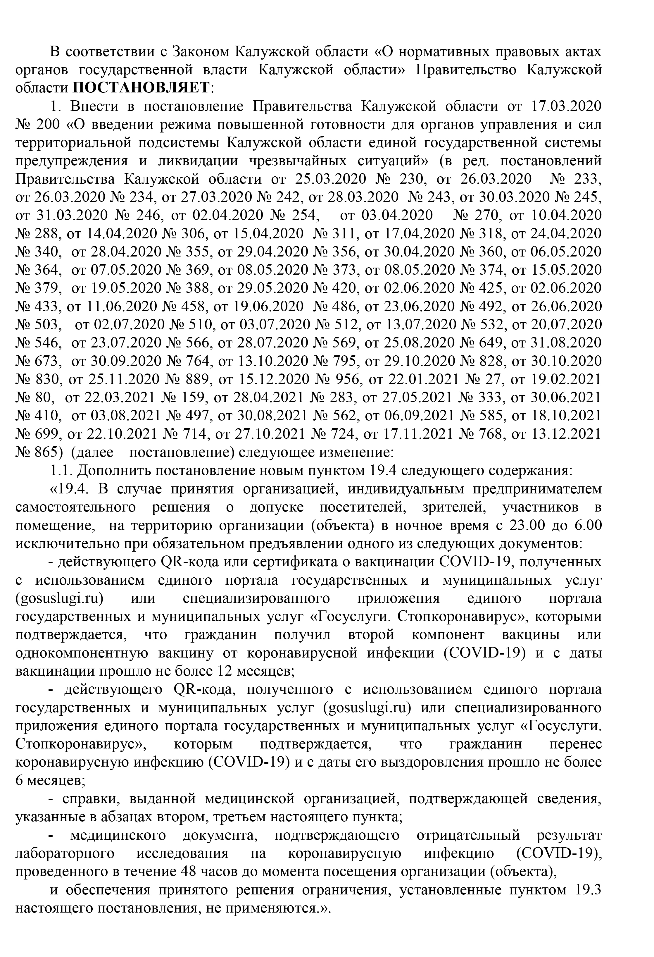 Опубликовано постановление правительства, которое разрешило ресторанам в Калужской области работать ночью по QR-кодам