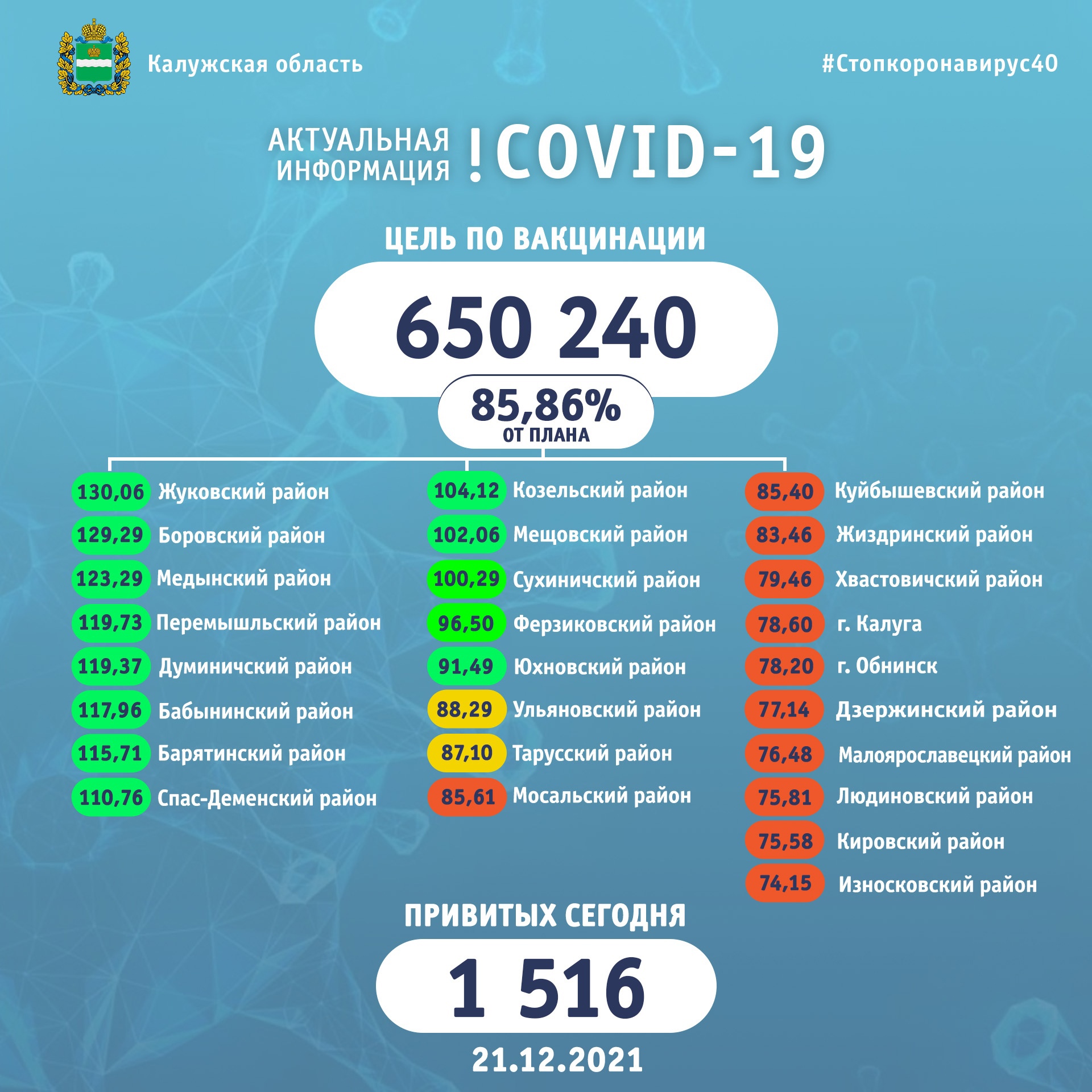 Выполнение плана по вакцинации от коронавируса в районах Калужской области на 21 декабря 2021 года: