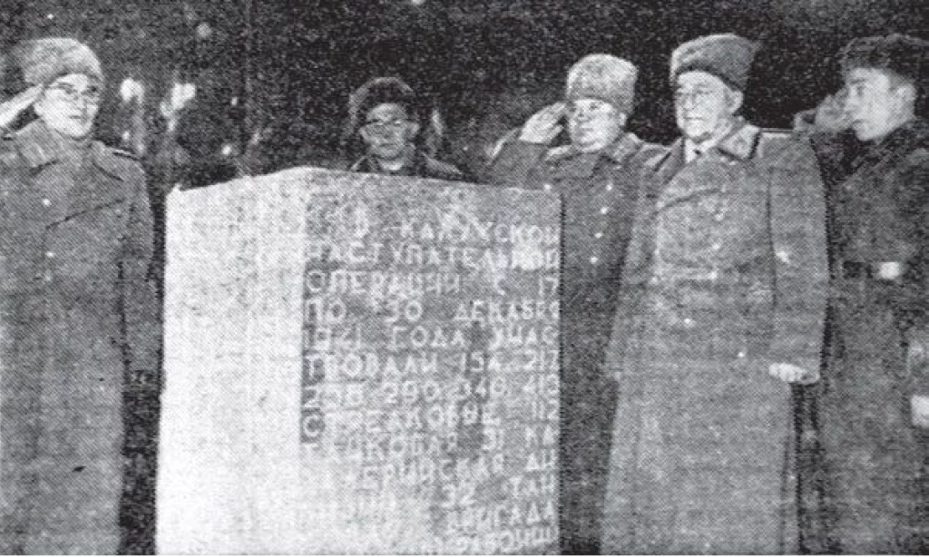 1966 – на площади Победы после общегородского факельного шествия состоялось торжественное открытие монумента в честь 25-летия разгрома немецко-фашистских войск под Москвой и освобождения города Калуги. «От благодарных калужан на годы, на века, навсегда». Открыть монумент доверили генерал-лейтенанту запаса Д. К. Малькову, председателю горисполкома Г. Н. Чиликину, генерал-лейтенанту К. Л. Сорокину, генералу армии А. Л. Гетману, Герою Социалистического Труда В. П. Аманшину и рядовому В. Титову.