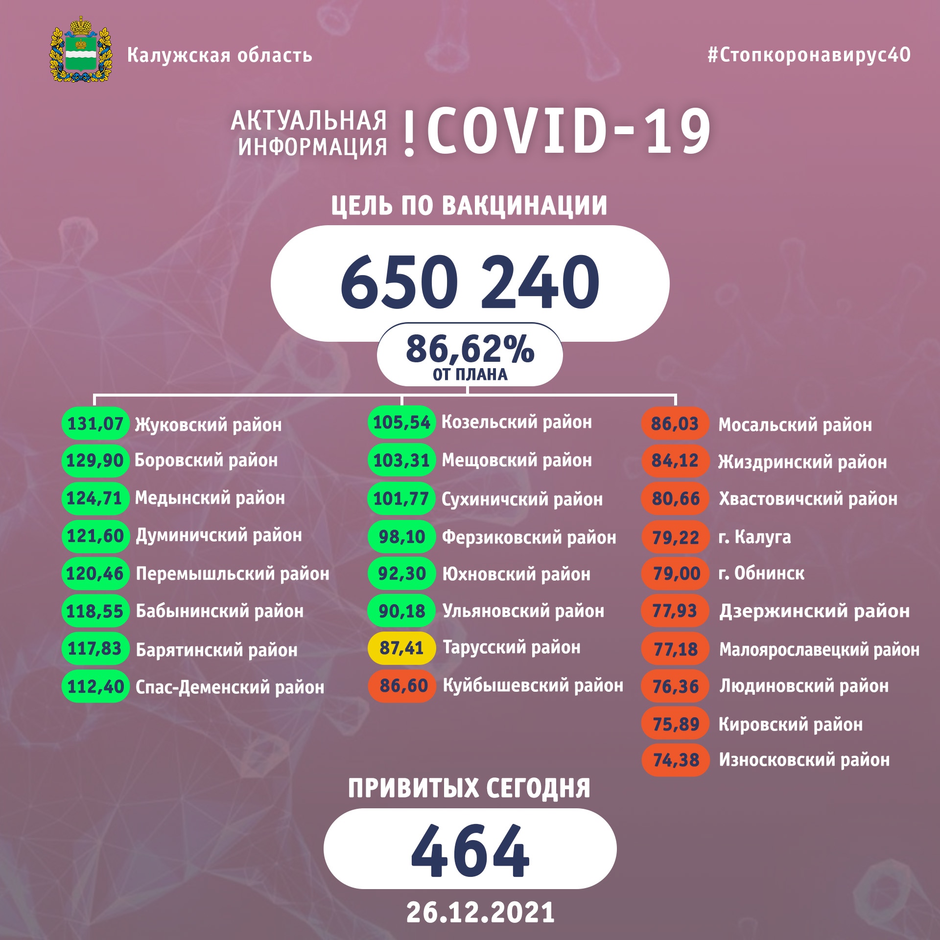 Выполнение плана по вакцинации от коронавируса в районах Калужской области на 25 декабря 2021 года: