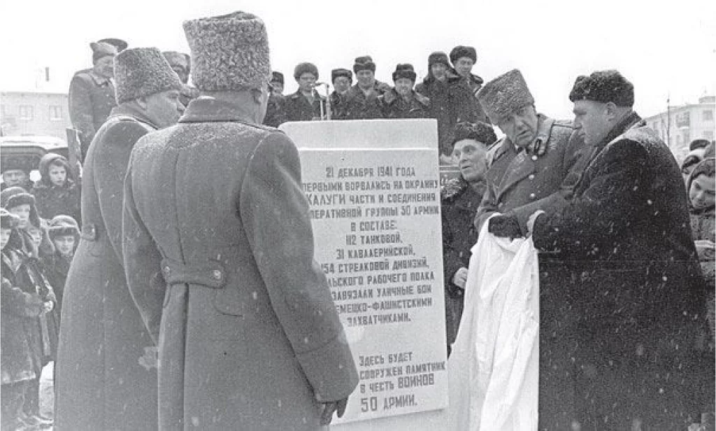 1966 – в канун празднования 25-летия освобождения Калуги от немецко-фашистских захватчиков в сквере в честь 20-летия Победы, который получил такое название в мае 1965 года, а позднее, по просьбам ветеранов, был переименован в сквер Ветеранов освобождения Калуги, состоялся торжественный митинг. В ходе него был открыт памятный камень на месте будущего мемориала воинам частей Красной Армии, освободившим наш город в конце декабря 1941 г. Тогда же было принято решение, что здесь будет поставлен на пьедестал танк Т-34. 5 ноября 1967 года принятое решение было осуществлено, и танк Т-34 с 85-миллиметровой пушкой был установлен на постамент.