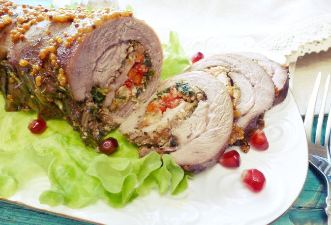 Аккуратно и уверенно свернуть мясо индейки со шпинатом, орехами и сладким перцем в рулет и связать кулинарной нитью.