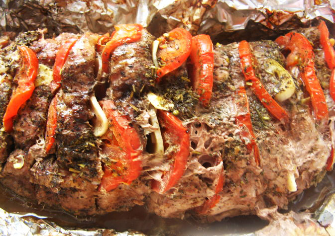 Все упаковываем в фольгу, связываем (например, шпагатом) и запекаем мясо в духовке в фольге 1,5–2 часа при температуре 180–190 градусов.