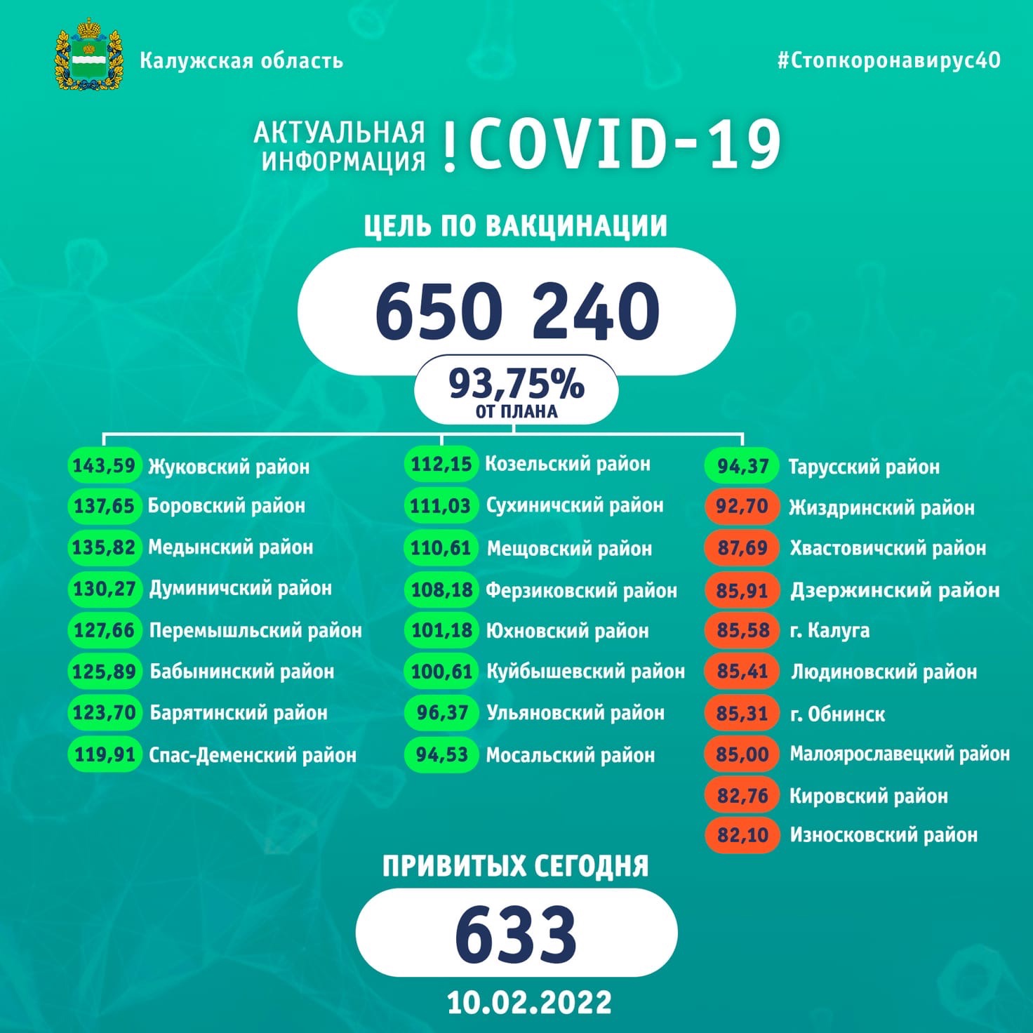 Выполнение плана по вакцинации от коронавируса в районах Калужской области на 10 февраля 2022 года: