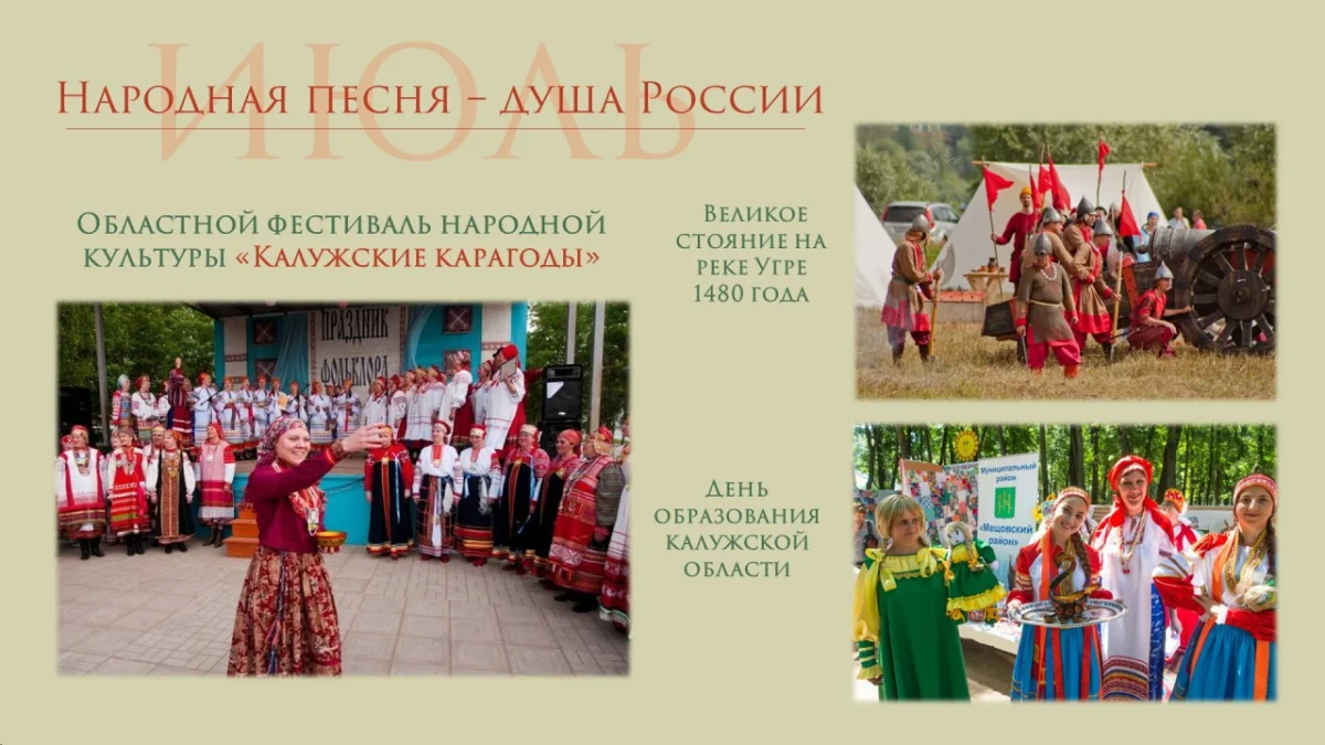 Калужские представители примут участие в крупных всероссийских проектах: Конгрессе фольклористов, Детской фольклориаде, Фестивале любительских творческих коллективов, выставке-ярмарке народных художественных промыслов России «Ладья».