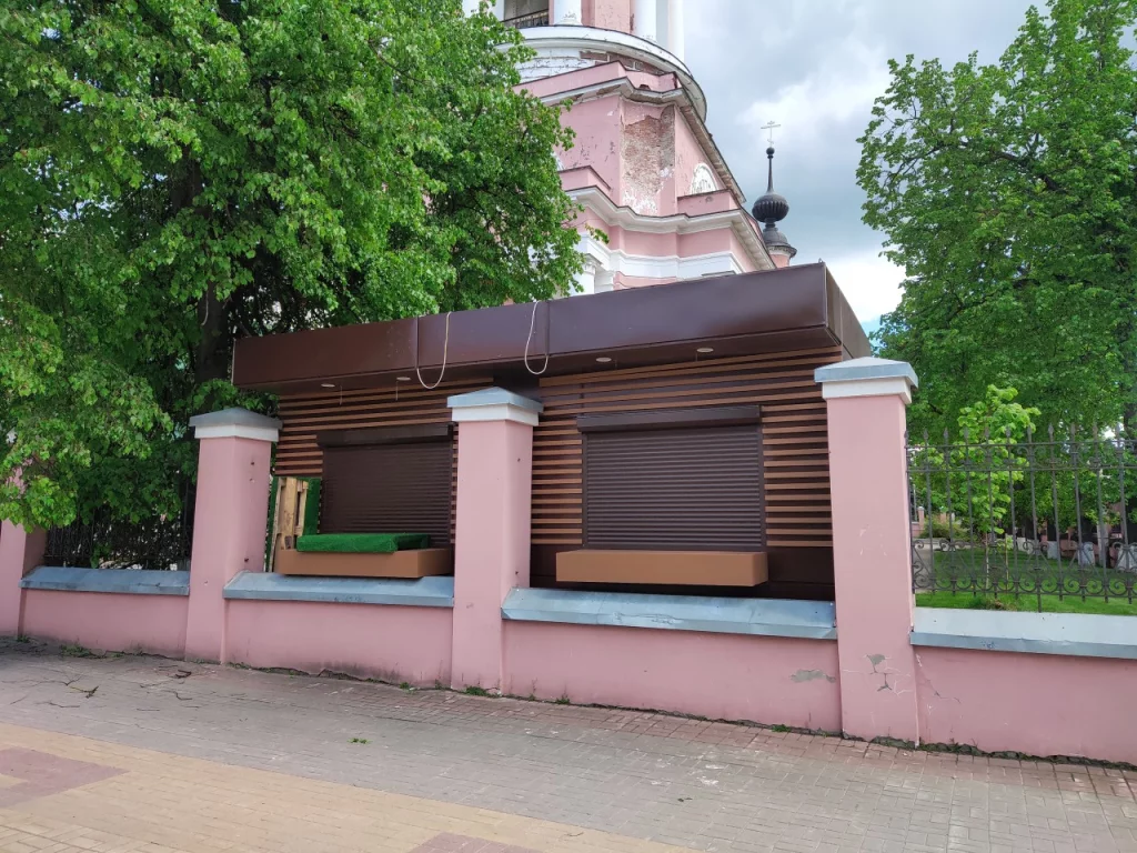 Все упоминания о фастфуде с киоска убрали. Холодильник перенесли за ограду церкви.