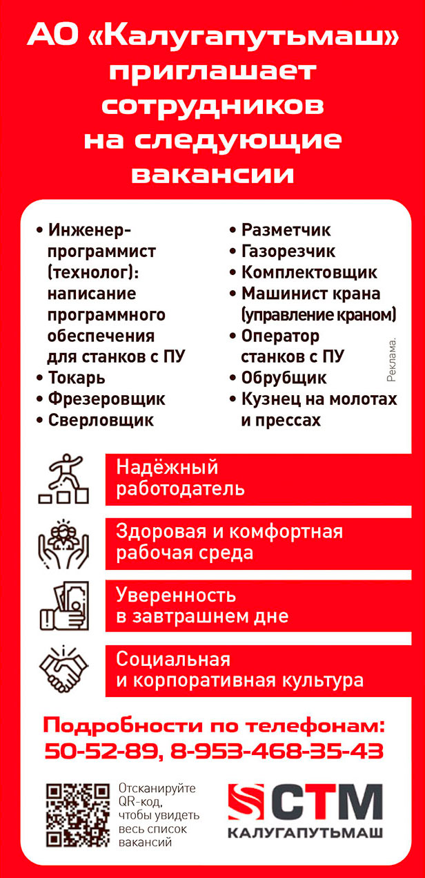 Одно из ведущих предприятий Калужской области — завод «Калугапутьмаш» (входит в число крупнейших машиностроительных холдингов «Синара — Транспортные Машины», СТМ) — интенсивно развивается, работать здесь престижно и интересно.