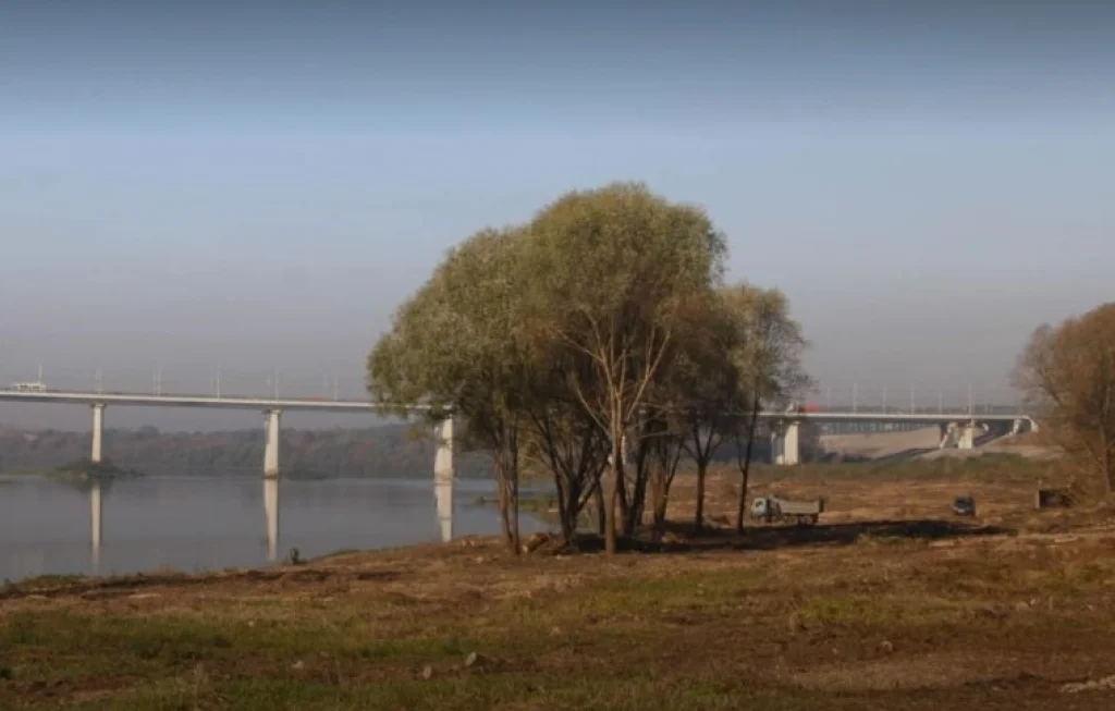 Уложены георешетки на склоне. Завозят песок для обустройства пляжа. Как сказал Дмитрий Денисов, песчаный пляж будет пролегать от Гагаринского моста до понтонной переправы.