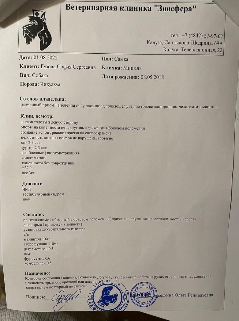 Ветеринар в Калуге поставил предварительный диагноз: черепно-мозговая травма, шок, вестибулярный синдром.