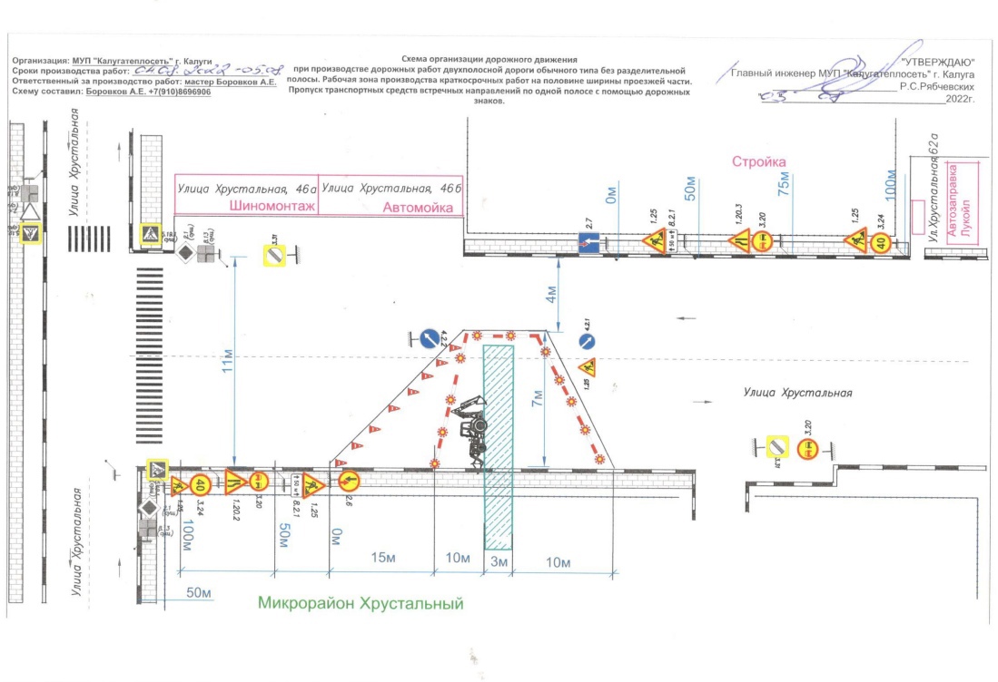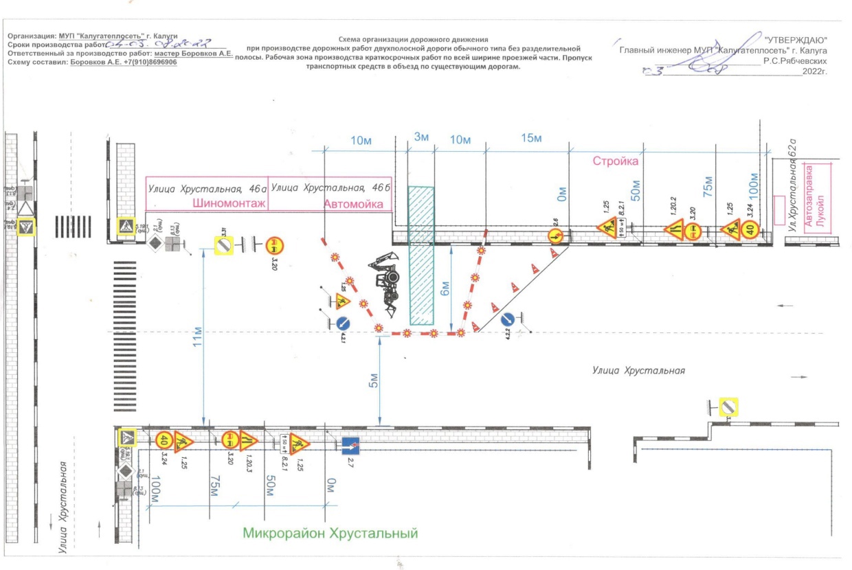 4 августа с 9:00 до 20:00 на ул. Хрустальной МУП «Калугатеплосеть» будет проводить ремонтные работы на участке дороги в районе домов № 46а (Шиномонтаж) и № 46б (Автомойка).