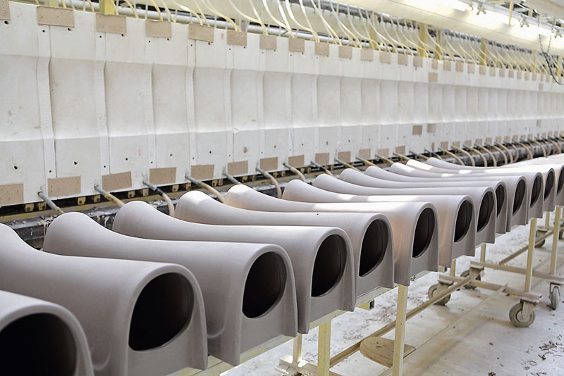 — Производство керамики — технологичный процесс, однако без внимания человека не обойтись, только человек может правильно подобрать рецептуру шликера или заметить мельчайшие неровности формы после сушки изделия и заботливо их отшлифовать. Мы стараемся минимизировать ручной труд и облегчить работу наших сотрудников. Поэтому на нашем производстве есть целый ряд механических помощников, например, промышленный робот Kuka, установленный на машине литья под давлением унитазов, он самостоятельно достает отлитое изделие из формы и переставляет его на конвейер. Так, один унитаз после выемки из формы весит почти 20 кг. Поэтому работает с ним не человек, а робот. Такая технология позволяет не только производить больше продукции за единицу времени, но и минимизирует ручной труд, сберегая здоровье наших работников. Помимо роботов мы также используем манипуляторы. Это, как рука, но только металлическая, очень сильная и прочная. Современные стенды традиционного литья, установленные на нашем заводе, укомплектованы манипуляторами, которые исключают тяжелый физический труд, связанный с перемещением изделий. Манипуляторы вынимают изделия из форм и перемещают их на конвейер. Оснащенность подобными манипуляторами позволяет привлекать для работы на участок традиционного литья и мужчин, и женщин вне зависимости от их физических сил и комплекции. Среди манипуляторов есть также и те, которые снимают с вагонеток изделия после обжига в печи и переставляют их на конвейер для дальнейшей проверки качества готового изделия. После того как изделие прошло контроль качества, его упаковывают, а готовые короба формируют в паллеты, используя манипуляторы. На одну паллету в соответствии со спецификацией могут собирать по 15 коробов с унитазами-компактами, что было бы невозможно без использования манипуляторов. Есть еще и другие машины, но цель их всех — облегчить работу человека.
