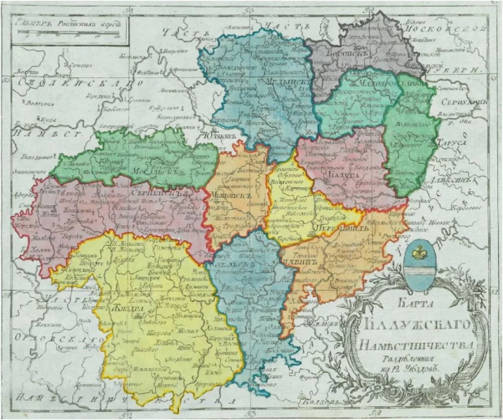 1776 – Указом императрицы от 26.10.1776 г. в составе Калужского наместничества были утверждены 12 уездов: Калужский, Козельский, Перемышльский, Малоярославецкий, Серпейский, Мосальский, Одоевский, Лихвинский, Мещовский, Тарусский, Боровский и Медынский. После образования Тульского наместничества 19 сентября 1777 г. в его состав был переведен Одоевский уезд. 19 октября того же года был образован новый Жиздринский уезд.
