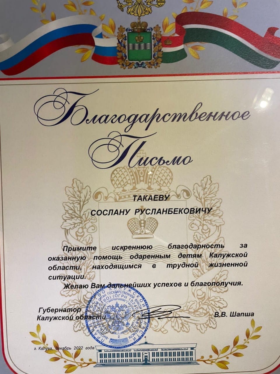 Депутат законодательного Собрания калужской области Сослан Такаев принял участие в торжественном мероприятии, проводимом губернатором Калужской области Владиславом Шапшой и депутатом Госдумы Геннадием Скляром, по чествованию одаренных детей Калужской области и вручении им стипендий РОО «Калужское землячество», проходившем в ДК ФЭИ города Обнинск.
