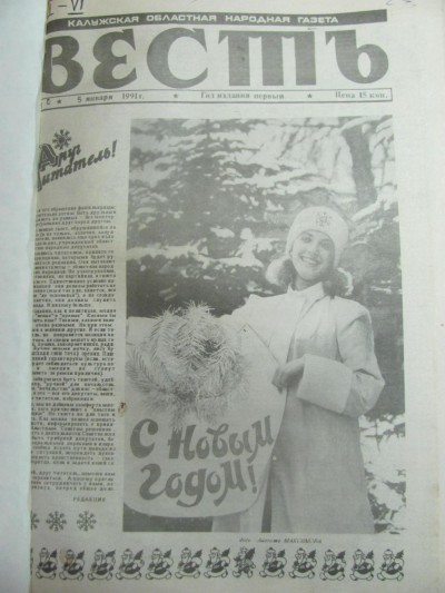 1991 – вышел первый номер Калужской областной газеты "Весть". Коллектив редакции газеты удостоен медали «Честь и польза» за содействие и освещение темы благотворительности в 2004, журналисты Виктор Вдовенков и Марина Улыбышева награждены медалью «Ордена за заслуги перед Отечеством» в 2000 и 2002. Главный редактор издания – Юрий Расторгуев. (Источник: Золотин А. Начало 1991 // Весть. - 2011. - 5 января; Летопись продолжающихся и периодических изданий: 1 января - 31 декабря 1991. - М.: Книжная палата, 1993. - С. 143. - № 108.)