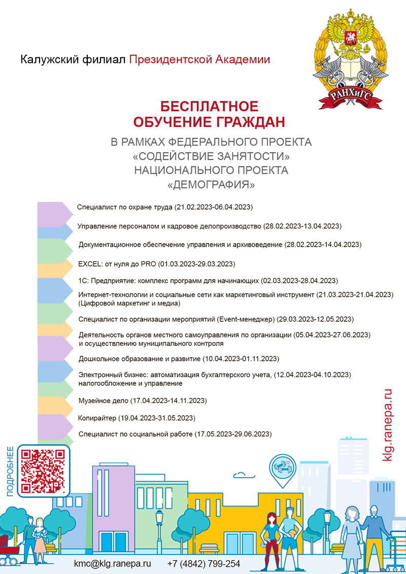 В рамках федерального проекта «Содействие занятости» национального проекта «Демография» Калужский филиал РАНХиГС проводит бесплатное обучение граждан.
