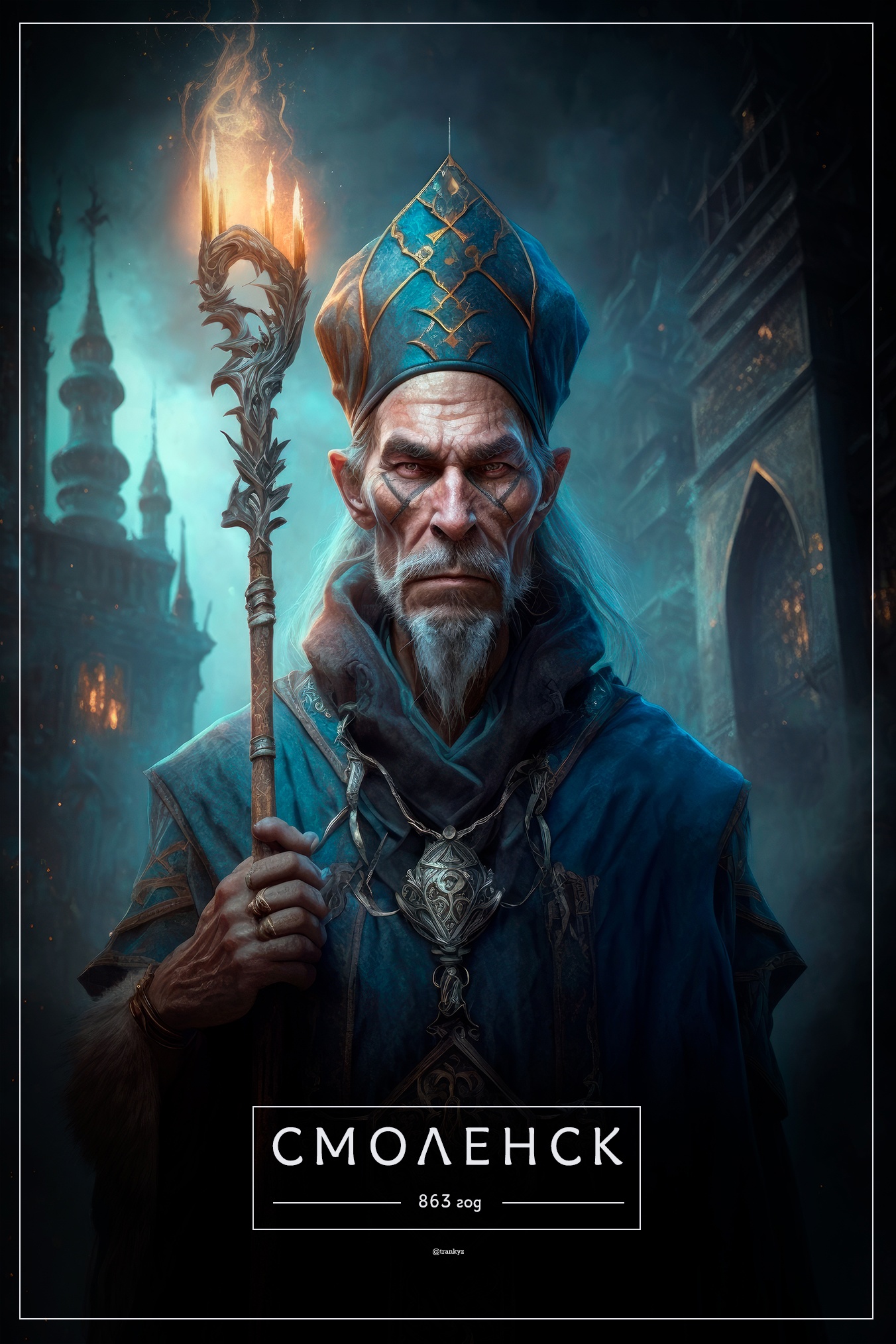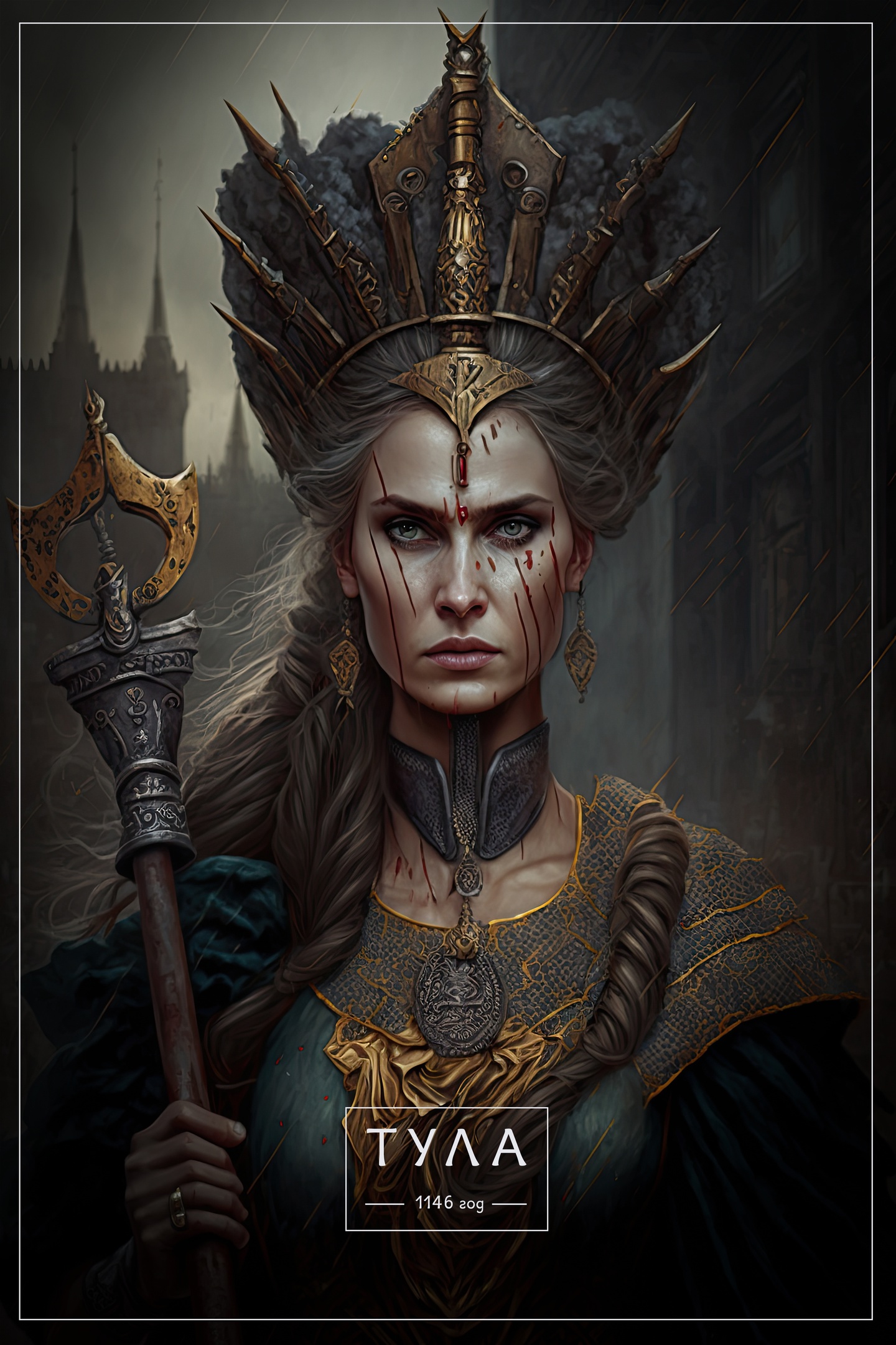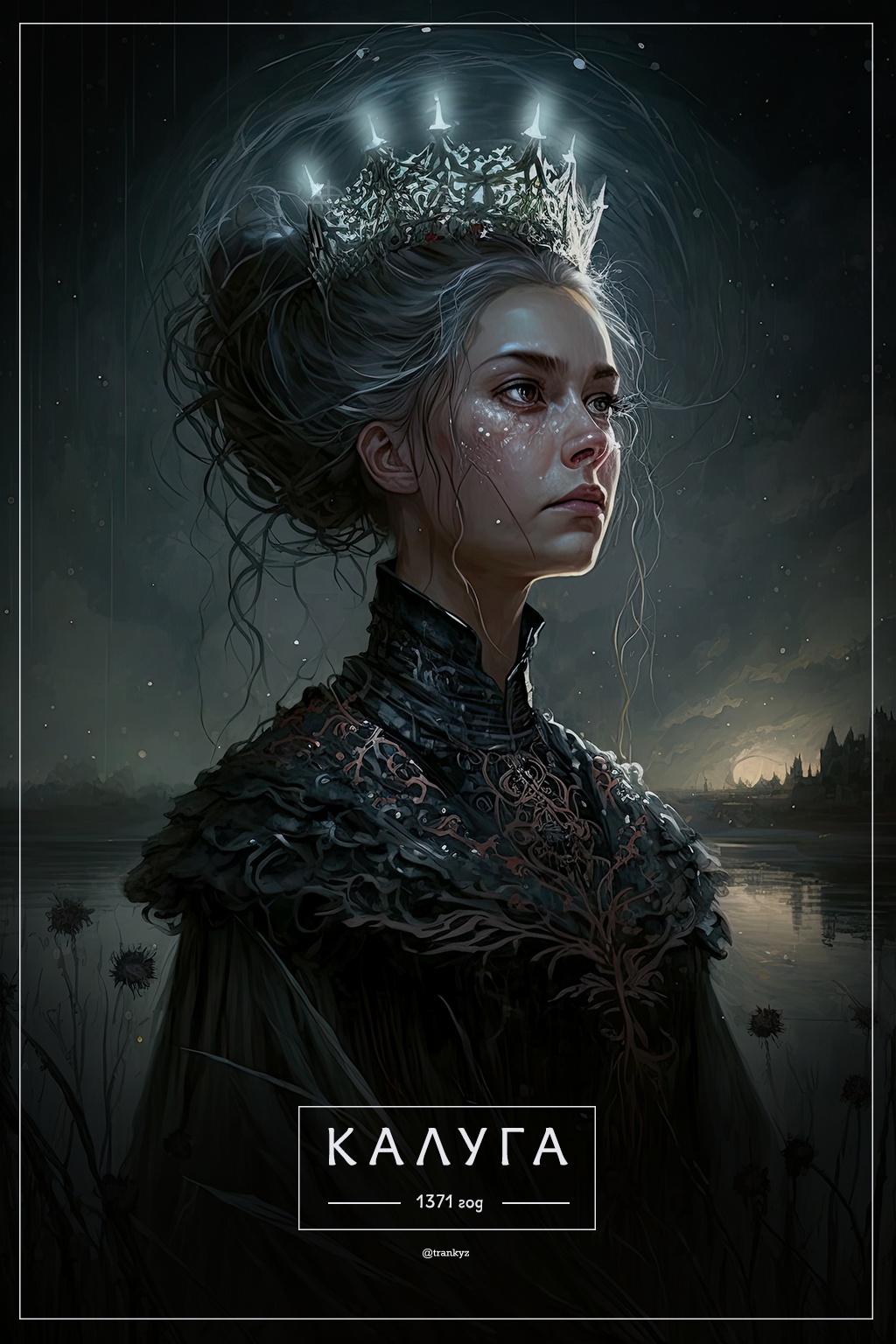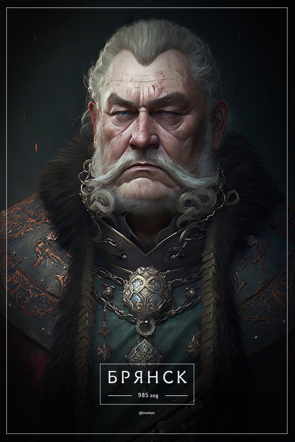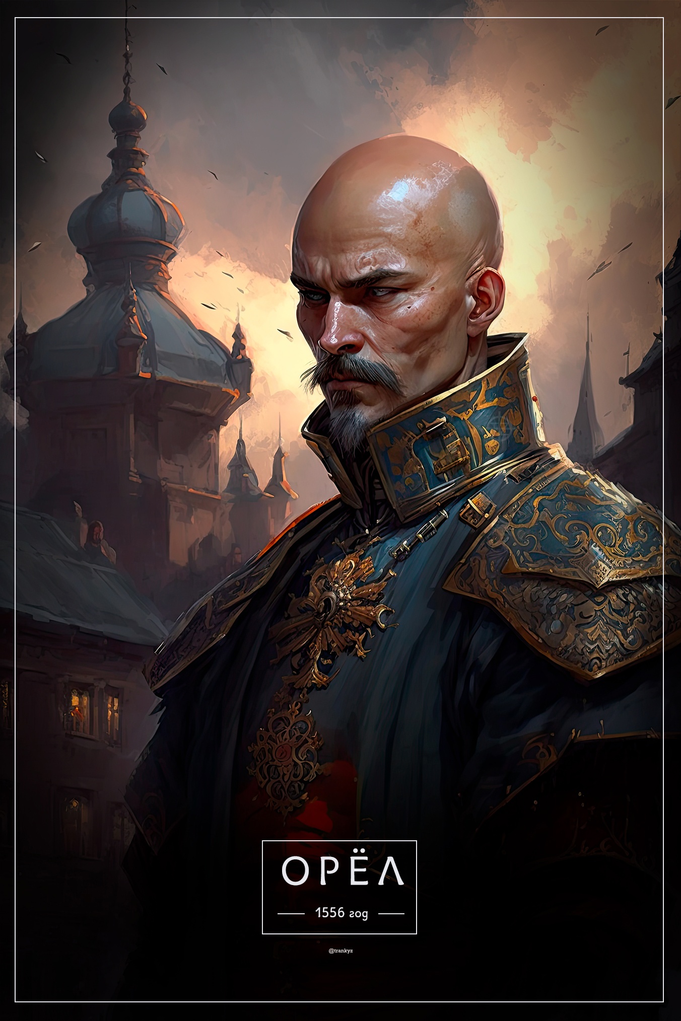Рисунки выполнила нейросеть Midjourney. Как пояснил автор, он делал запрос «название города+описание+темный портрет русского царя».