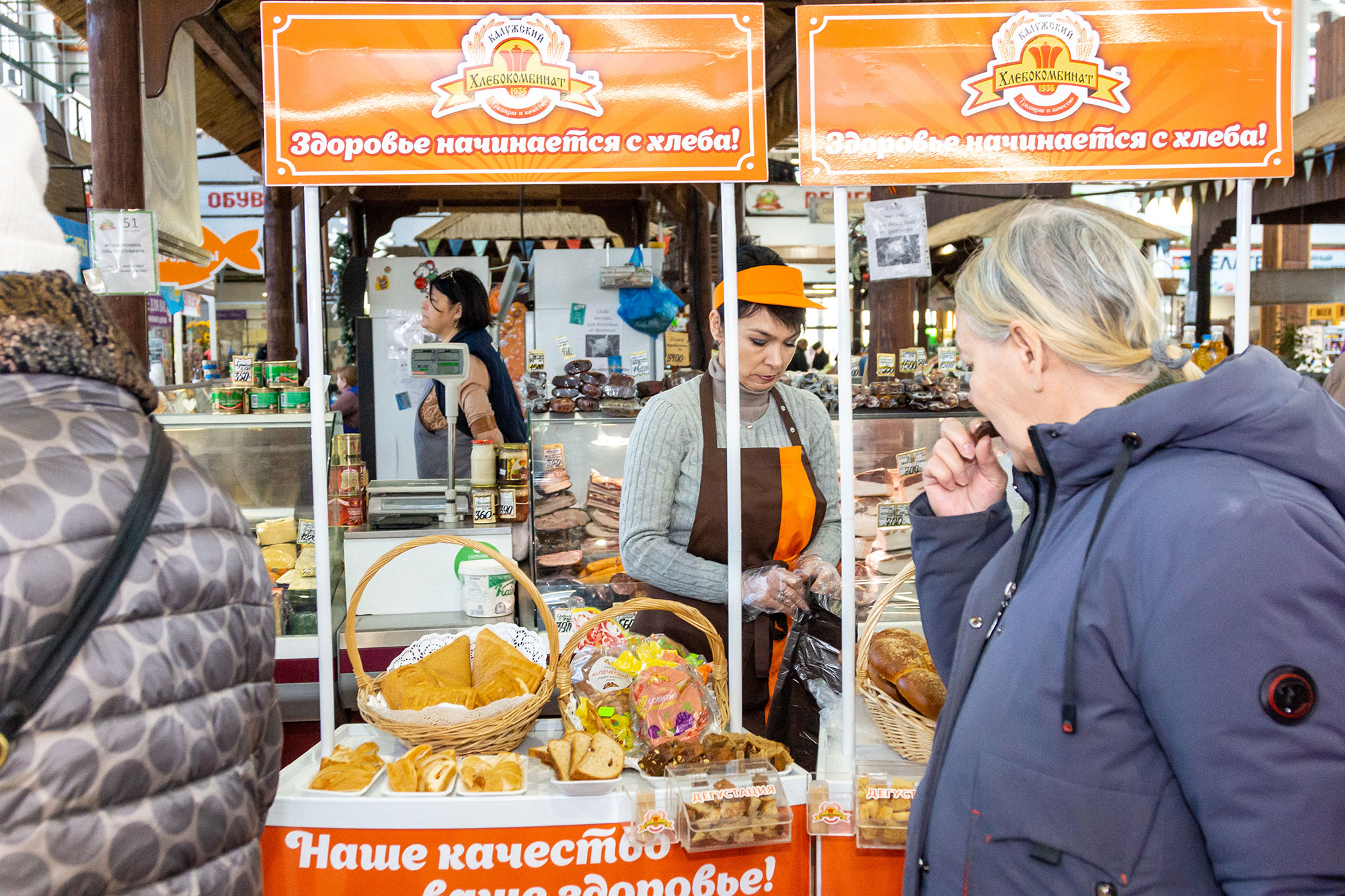 Здесь, на первом этаже, всех входящих приглашали отведать кисломолочную и мясную продукцию, разнообразные хлебобулочные и кондитерские изделия.