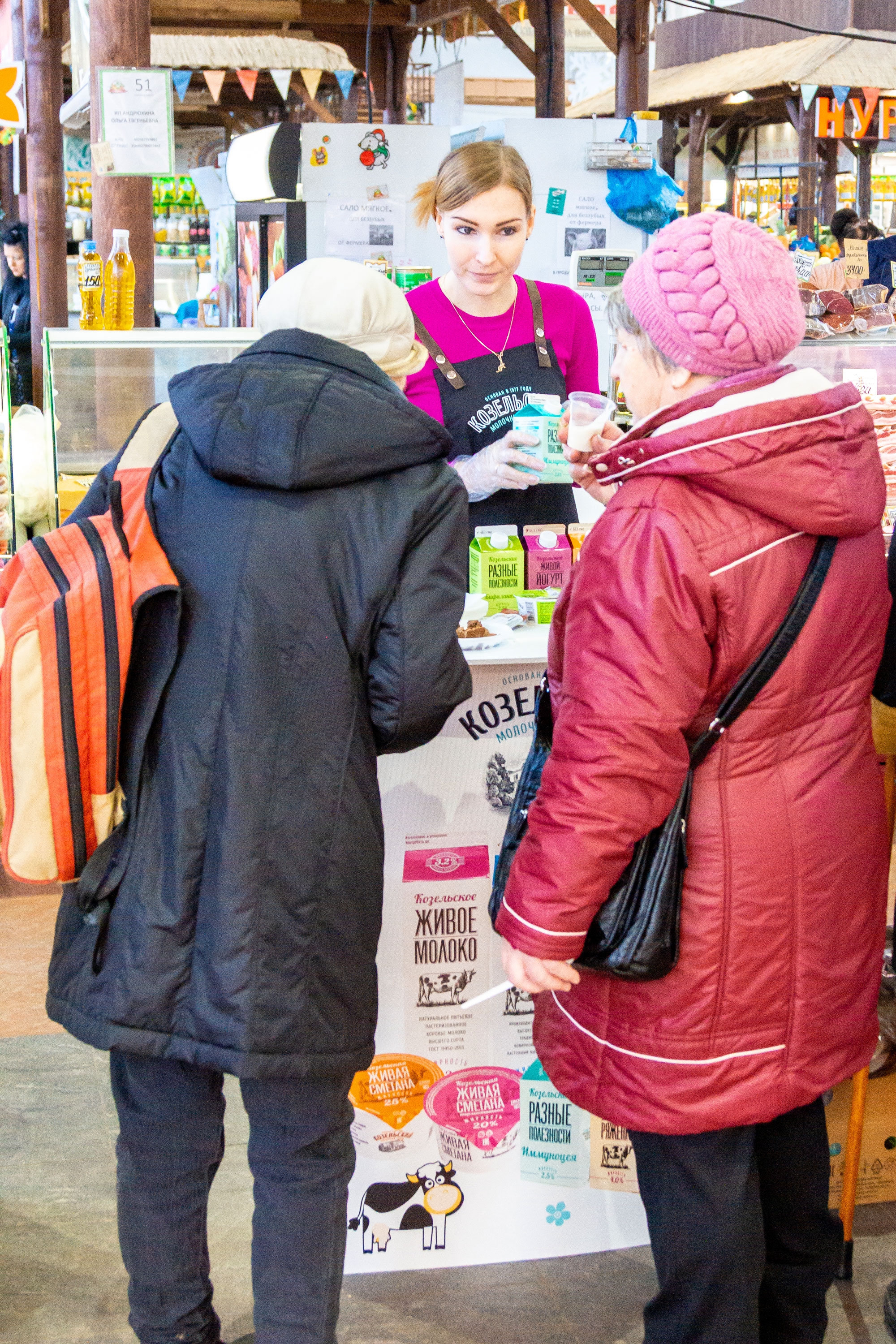Козельский завод представил продукцию для дегустации на городском рынке: приветливая сотрудница молочного завода и яркое оформление встречали калужан.