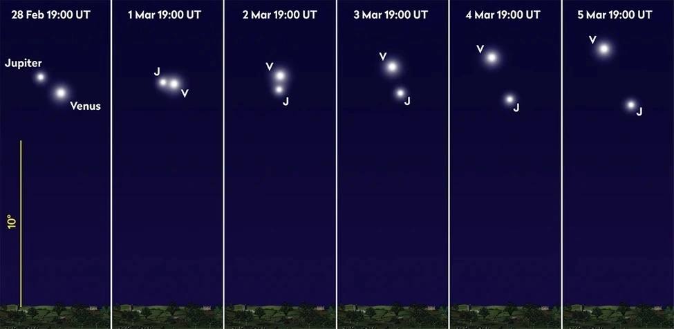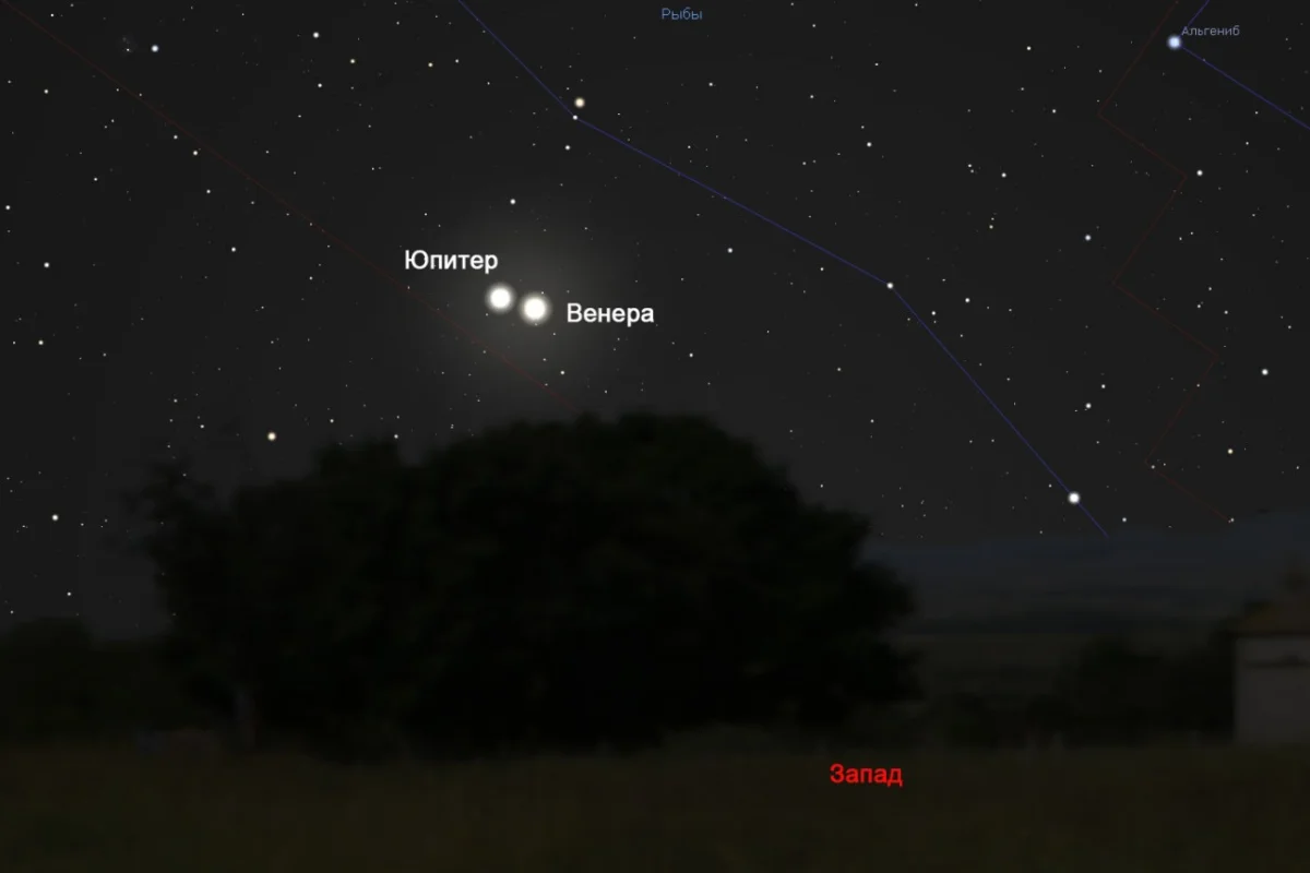В небе рядом окажутся Венера и Юпитер. Как пояснили специалисты, в реальности между этими планетами 650 миллионов километров.