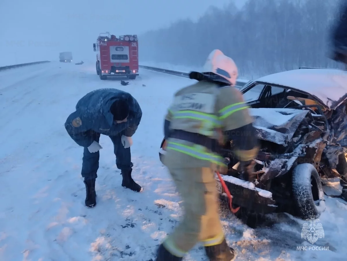 Рано утром в Калужской области на заснеженной трассе «Девятка» протаранила «Ниссан»