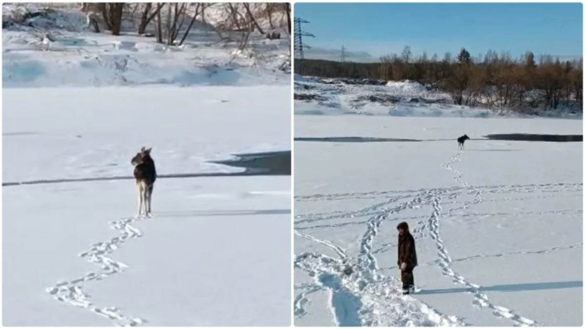 Но после спасения неразумный молодой лось опять пошел по кромке проталины на реке.