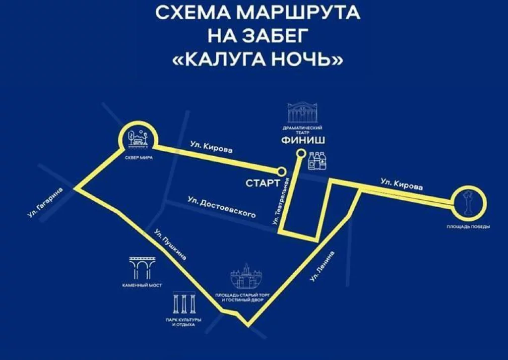 Участники в 22:00 стартуют с Театральной площади, дальше направятся к скверу мира, по улицам Гагарина, Пушкина, Каменному мосту, Старом Торгу, улицам Ленина, Кирова, площади Победы, потом опять по Кирова, завернут на Московскую, пробегут по Достоевского, Театральной и финишируют у драмтеатра.