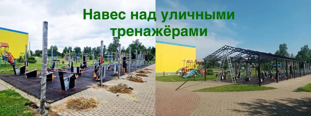 Над уличными тренажёрами у ФОКа установлен металлический каркас, ведётся монтаж обрешётки под металлочерепицу.