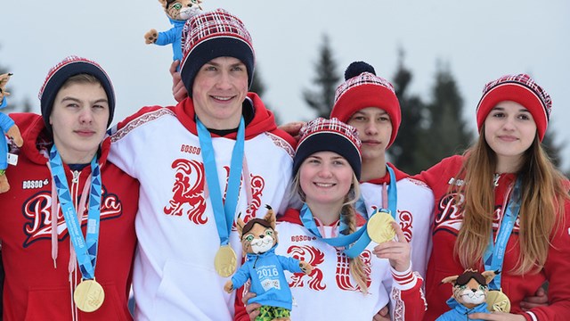 Слева-направо: Виталий Иванов (двоеборье), Игорь Федотов, Майя Якунина (оба - лыжные гонки), Максим Сергеев и Софья Тихонова (оба - прыжки на лыжах).