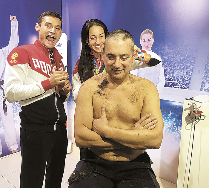 Тимур САФИН и Яна ЕГОРЯН стригут своего тренера Ильгара МАМЕДОВА наголо.
