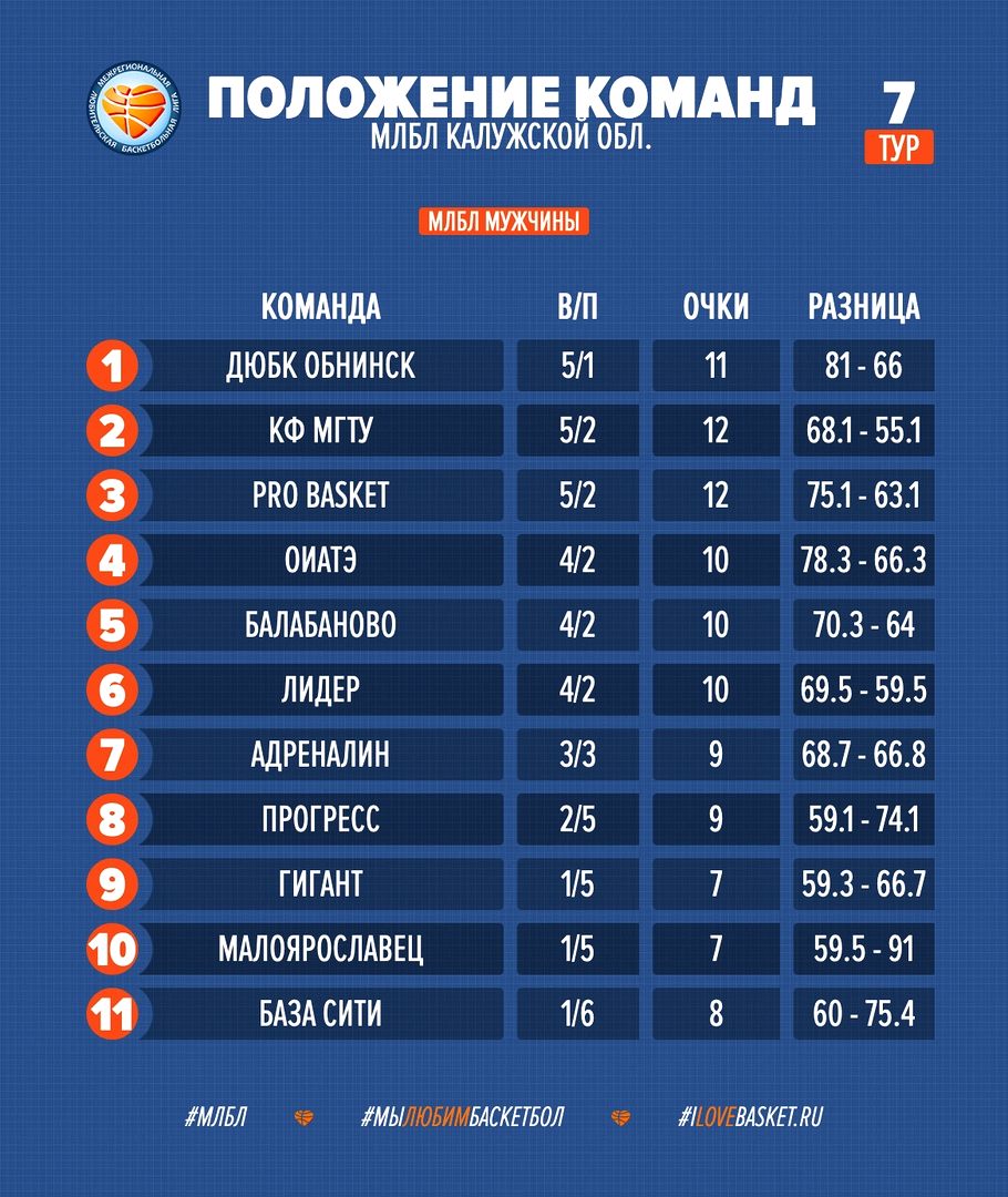 Матчи 7 тура Межрегиональной любительской баскетбольной лиги Калужской области принесли несколько результатов, которые внесли значительные изменения в турнирной таблице.