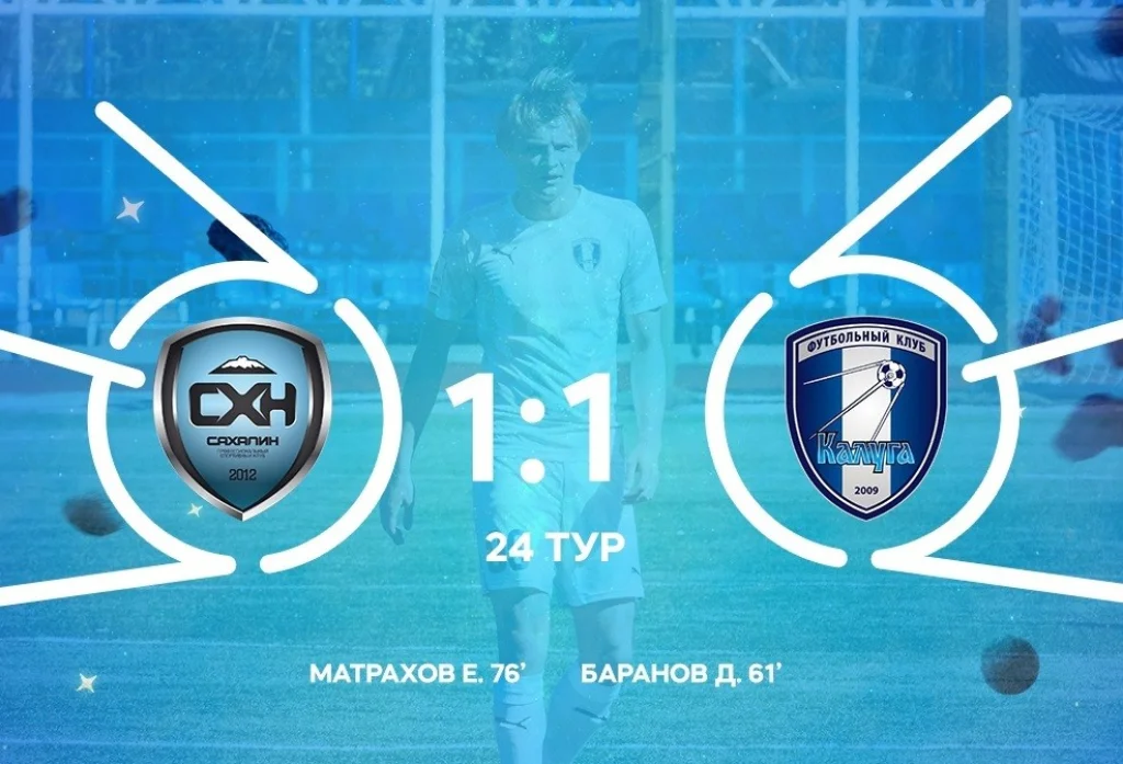 Калужане выглядели лучше своих соперников и заслуженно повели в счете на 61-ой минуте. Гол в ворота «Сахалина» забил 39-летний ветеран Дмитрий Баранов.