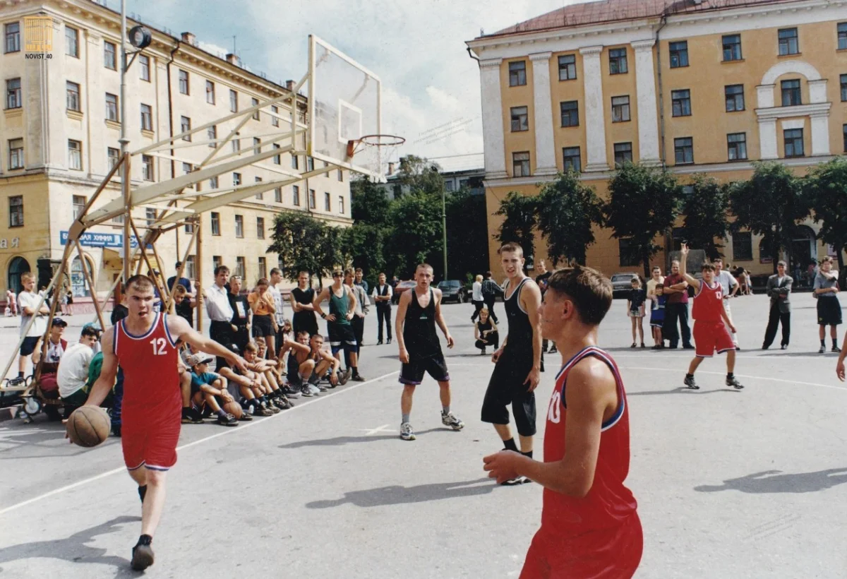 На первых двух снимках баскетболисты во время игры, проходившей на празднике «День молодежи» на Театральной площади в Калуге. 1997 год.