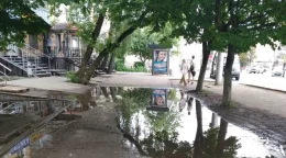 Калужане жалуются губернатору на глубокие лужи на плиточном тротуаре площади Победы.