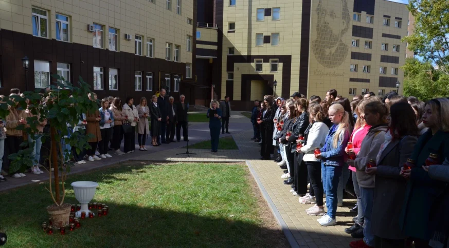 Во внутреннем сквере КГУ юноши и девушки напоили деревья водой из рук, сложенных лодочкой, и установили на дорожках сквера зажженные лампадки.