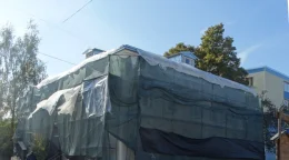 Прелести капремонта. В доме на улице Кутузова вместо крыши до сих пор натянут брезент.