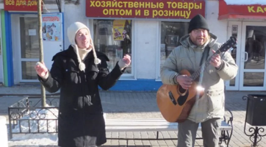 Несмотря на холод, Денис и Илона Пахомовы вышли на улицу – радовать горожан и заработать копеечку.