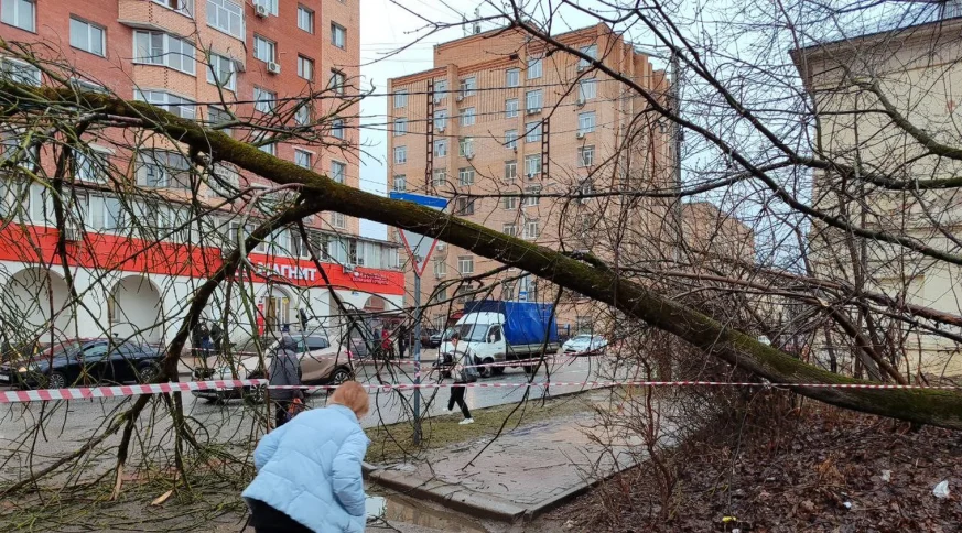 Сильный ветер повалил дерево у дома №8 по проспекту Маркса.