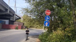 В районе съезда с путепровода на улицу Путейскую появились знаки, сигнализирующие об одностороннем движении.