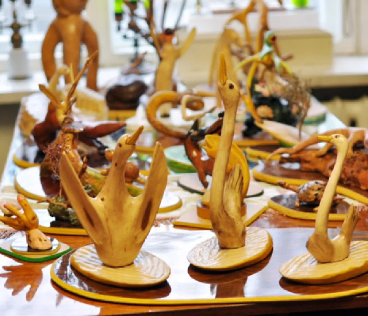 - На этом куске дерева просматриваются черты лица, а эта веточка мне напоминает балерину, - рассказывает Юрий Левченков, демонстрируя свои произведения. – Вот такая у меня есть Нефертити, а это персонажи из русских народных сказок – волк и лиса.