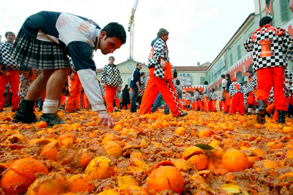 В эти дни в центре небольшого города на севере Италии творится нечто безумное: толпы людей в карнавальных костюмах кидаются прошлогодними апельсинами, а с балконов на них летит конфетти. Это традиционный «апельсиновый карнавал», напоминающий испанские «помидорные побоища». В битве принимают участие и туристы: не так-то просто взирать со стороны, как сочные апельсины попадают кому-то в лоб, катятся по мостовой и давятся под ногами.