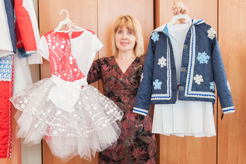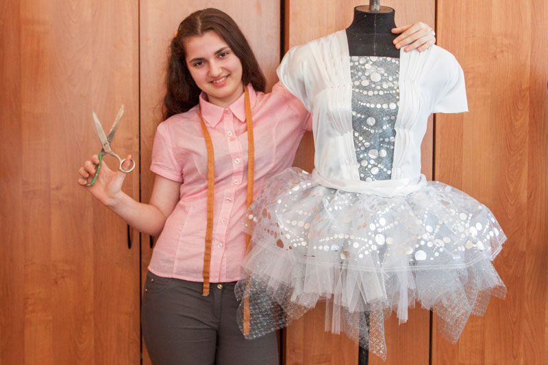 - Тема конкурса была «На Олимпийской волне». Мы с девочками стали думали, что же сделать? Решили участвовать в двух номинациях: придумать коллекцию олимпийской одежды, а на манекене сконструировать платье фигуристки, - рассказывает педагог дополнительного образования объединения «Театр моды» отдела изобразительного искусства и декоративно-прикладного творчества центра «Созвездие» Ольга ПОЛЬКИНА. - Сначала выбрали розовую ткань и заложили складки –не понравилось, потом попробовали ассиметрию, тоже - не то. И тогда придумали более классический вариант. Одна сторона у платья - блестящая, другая – матовая. Сзади сделали складки и переплели их. Фатин порезали на ленточки и завязали узелками – получилась пышная юбка, на нее ушло три метра ткани.