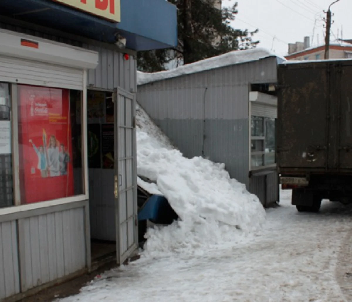 Металлическая конструкция, расположенная между двумя киосками, не выдержала массы снега и наледи. К счастью, в момент обрушения рядом не было никого из людей.