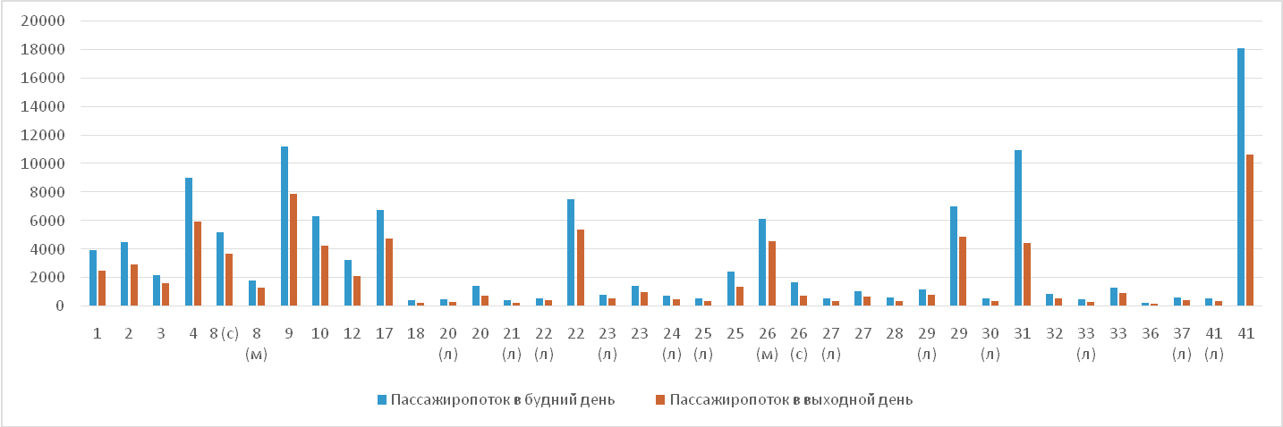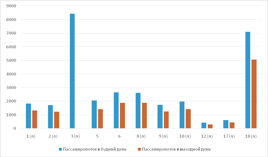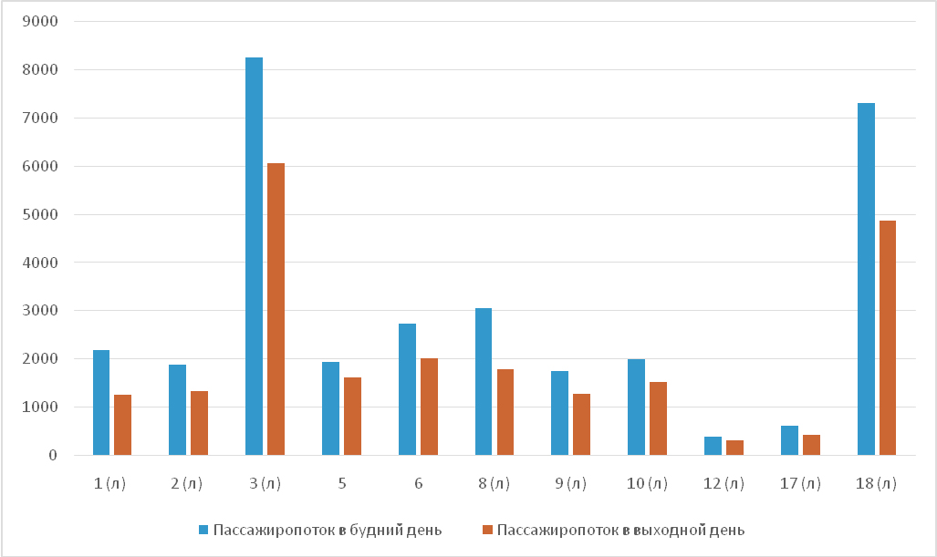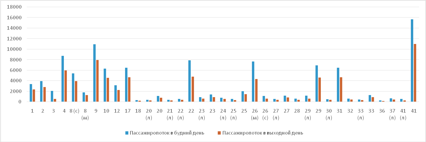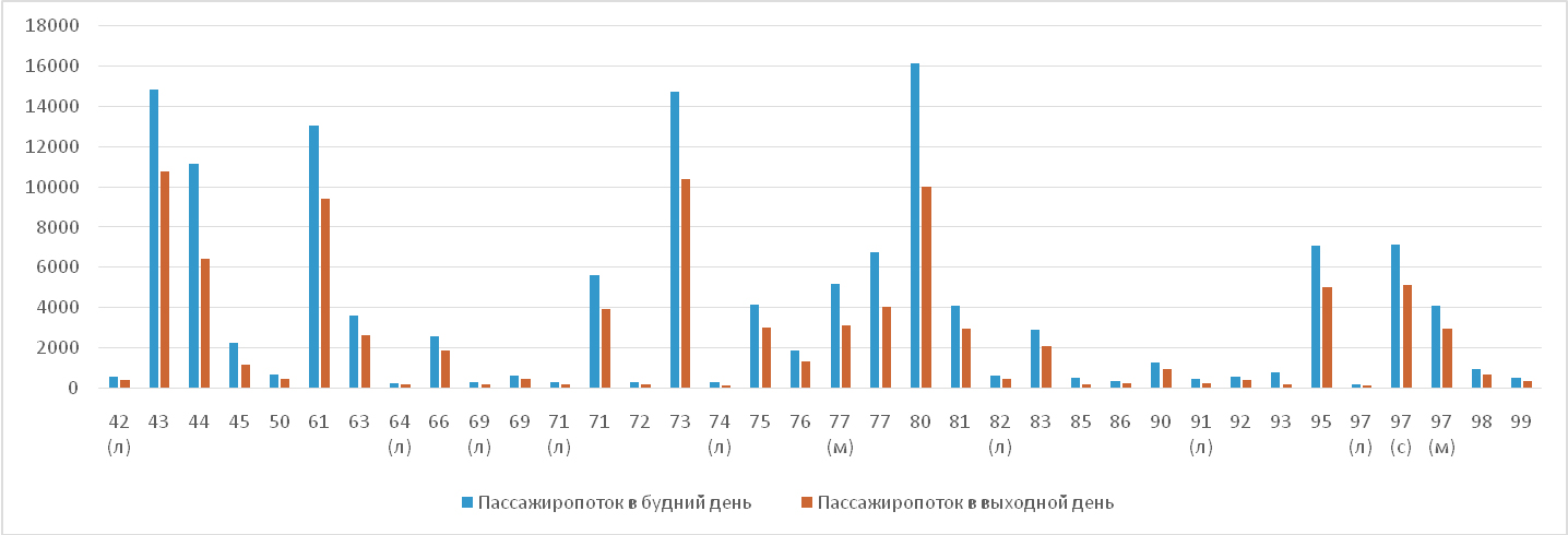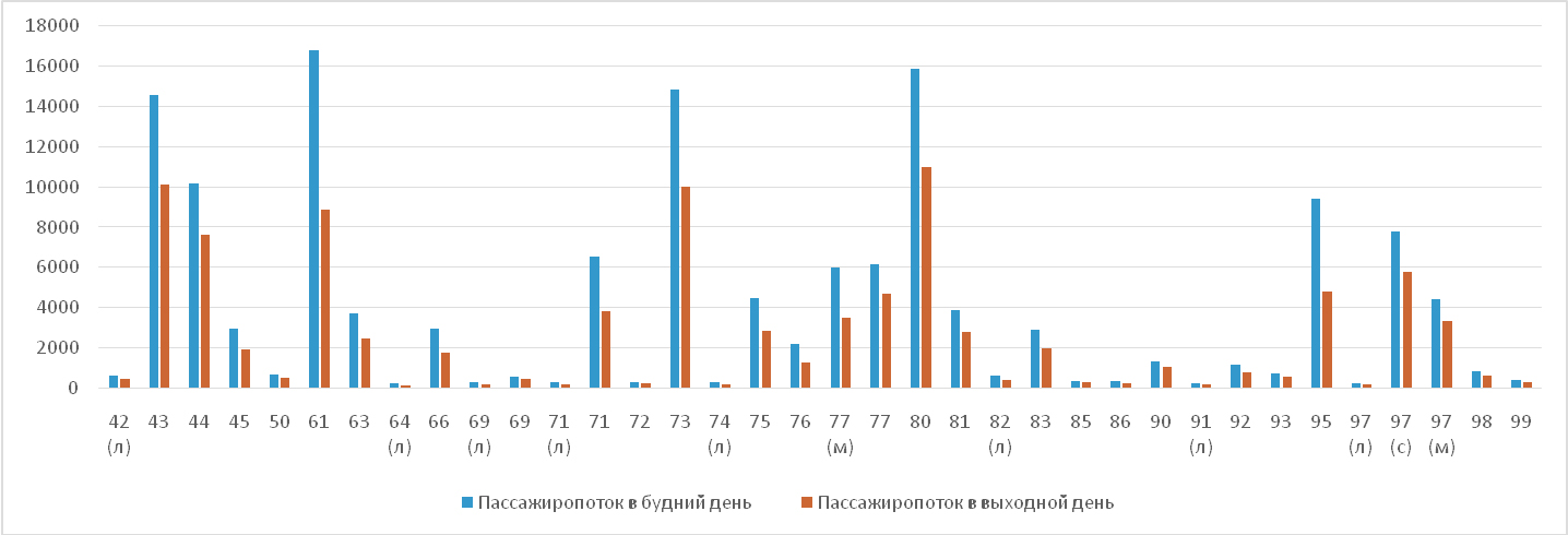 – на всех маршрутах общественного транспорта пассажиропоток в будний день превышает показатели выходного дня;